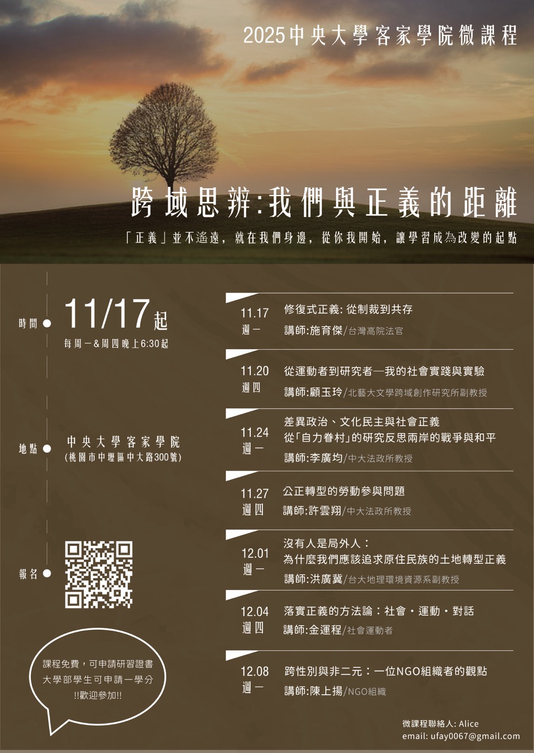 【歡迎報名】114-1學期客家學院法政所微課程「跨域思辨:我們與正義的距離」