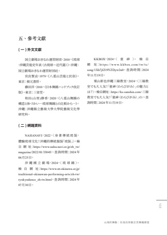 ( %u4e00 ) %u5916%u6587%u6587%u737b%u56fd%u7acb%u5287%u5834%u304a%u304d%u306a%u308f%u904b%u55b6%u8ca1%u56e3%uff0c2010%uff0c%u300a%u7409%u7403%u30fb%u6c96%u7e04%u82b8%u80fd%u53f2%u5e74%u8868%uff08%u53e4%u7409%u7403%uff5e%u8fd1%u4ee3%u7bc7%uff09%u300b%u3002%u6c96%u7e69%uff1a%u56fd%u7acb%u5287%u5834%u304a%u304d%u306a%u308f%u904b%u55b6%u8ca1%u56e3%u793e%u3002%u5bae%u826f%u8ce2%u8c9e%uff0c1979%uff0c%u300a%u516b%u91cd%u5c71%u82b8%u80fd%u3068%u6c11%u4fd7%u300b%u3002%u6771%u4eac%uff1a%u6839%u5143%u66f8%u623f%u3002%u85e4%u7530%u6d0b%uff0c2010%uff0c%u300a%u65e5%u672c%u821e%u8e0a%u30cf%u30f3%u30c9%u30d6%u30c3%u30af%u6539%u8a02%u7248%u300b%u3002%u6771%u4eac%uff1a%u4e09%u7701%u5802%u3002%u548c%u7530(%u5c71%u91cc)%u9759%u9999%uff0c2020%uff0c%u300a%u516b%u91cd%u5c71%u821e%u8e0a%u306e%u69cb%u9020%u3068%u4f53%u3065%u304b%u3044%u2015%u7409%u7403%u821e%u8e0a%u3068%u306e%u6bd4%u8f03%u304b%u3089%u2015%u300b%u3002%u6c96%u7e69%uff1a%u6c96%u7e69%u7e23%u7acb%u85dd%u8853%u5927%u5b78%u5927%u5b78%u9662%u85dd%u8853%u6587%u5316%u5b78%u7814%u7a76%u79d1%u3002( %u4e8c ) %u7db2%u8def%u8cc7%u6599NAHANAVI%uff0c2022%uff0c%u3008 %u8eab %u8457 %u50b3 %u7d71 %u7409 %u88dd%uff0c%u9ad4%u9a57%u7409%u7403%u6587%u5316%uff01%u6c96%u7e69%u7684%u50b3%u7d71%u670d%u88dd%u300c%u7409%u88dd%u300d%u3009%u3002%u6aa2%u81ea %u7db2 %u5740%uff1ahttps://www.naha-navi.or.jp/zh_tw/magazine/2022/01/33045/%u3002%u67e5%u8a62%u6642%u9593%uff1a2024%u5e7406%u670825%u65e5%u3002%u6c96 %u7e69 %u570b %u7acb %u5287 %u5834%uff0c2024%uff0c%u3008 %u7409 %u7403 %u8e0a %u3009%u3002%u6aa2 %u81ea %u7db2 %u5740%uff1ahttps://www.nt-okinawa.or.jp/traditional-okinawan-performing-arts/zh-tw/ryukyudance_zh-tw.html%u3002%u67e5%u8a62%u6642%u9593%uff1a2024%u5e7407%u670830%u65e5%u3002%u4e94%u3001%u53c3%u8003%u6587%u737bKKBOX%uff0c2024%uff0c%u3008 %u7ae5 %u795e %u3009%u3002 %u6aa2 %u81ea%u7db2 %u5740%uff1ahttps://www.kkbox.com/tw/tc/song/1Xh7jfZ19YZDytr2n0%u3002%u67e5 %u8a62%u6642%u9593%uff1a2024%u5e7411%u670819%u65e5%u3002%u6817%u5c71%u65b0%u4e5f%u6c96%u7e69%u4e09%u7dda%u6559%u5ba4%uff0c2024%uff0c%u3008%u4e09%u7dda%u6559%u5ba4%u3067%u3082%u5927%u4eba%u6c17%uff01%u300c%u7ae5%u795e%uff08%u308f%u3089%u3073%u304c%u307f%uff09%u300d%u306e%u9b45%u529b%u3068%u306f%uff1f%u3009%u3002%u6aa2%u81ea%u7db2%u5740%uff1ahttps://ks-sanshin.com/%u4e09%u7dda%u6559%u5ba4%u3067%u3082%u5927%u4eba%u6c17%uff01%u300c%u7ae5%u795e%uff08%u308f%u3089%u3073%u304c%u307f%uff09%u300d%u306e/%u3002%u67e5%u8a62%u6642%u9593%uff1a2024%u5e7411%u670819%u65e5%u3002103%u5c71%u6d77%u7684%u821e%u52d5%uff1a%u77f3%u57a3%u767d%u4fdd%u52e4%u738b%u6d41%u821e%u8e0a%u8abf%u67e5