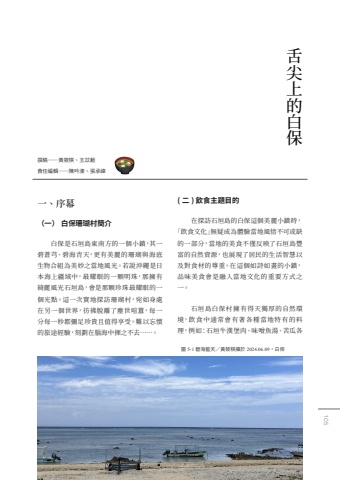 %uff08%u4e00%uff09 %u767d%u4fdd%u73ca%u745a%u6751%u7c21%u4ecb%u767d%u4fdd%u662f%u77f3%u57a3%u5cf6%u6771%u5357%u65b9%u7684%u4e00%u500b%u5c0f%u93ae%uff0c%u5176%u4e00%u78a7%u84bc%u828e%u3001%u78a7%u6d77%u9752%u5929%uff0c%u66f4%u6709%u7f8e%u9e97%u7684%u73ca%u745a%u8207%u6d77%u5e95%u751f%u7269%u5408%u7d44%u70ba%u7f8e%u5999%u4e4b%u7576%u5730%u98a8%u5149%u3002%u82e5%u8aaa%u6c96%u7e69%u662f%u65e5%u672c%u6d77%u4e0a%u7586%u57df%u4e2d%uff0c%u6700%u8000%u773c%u7684%u4e00%u9846%u660e%u73e0%uff0c%u90a3%u64c1%u6709%u7dba%u9e97%u98a8%u5149%u77f3%u57a3%u5cf6%uff0c%u6703%u662f%u90a3%u9846%u73cd%u73e0%u6700%u8000%u773c%u7684%u4e00%u500b%u5149%u9ede%u3002%u9019%u4e00%u6b21%u5be6%u5730%u63a2%u8a2a%u73ca%u745a%u6751%uff0c%u5b9b%u5982%u8eab%u8655%u5728%u53e6%u4e00%u500b%u4e16%u754c%uff0c%u5f77%u5f7f%u812b%u96e2%u4e86%u5875%u4e16%u55a7%u56c2%uff0c%u6bcf%u4e00%u5206%u6bcf%u4e00%u79d2%u90fd%u5f4c%u8db3%u73cd%u8cb4%u4e14%u503c%u5f97%u4eab%u53d7%u3002%u96e3%u4ee5%u5fd8%u61f7%u7684%u65c5%u9014%u7d93%u9a57%uff0c%u523b%u5283%u5728%u8166%u6d77%u4e2d%u63ee%u4e4b%u4e0d%u53bb%u2026%u2026%u3002( %u4e8c ) %u98f2%u98df%u4e3b%u984c%u76ee%u7684%u5728%u63a2%u8a2a%u77f3%u57a3%u5cf6%u7684%u767d%u4fdd%u9019%u500b%u7f8e%u9e97%u5c0f%u93ae%u6642%uff0c%u300c%u98f2%u98df%u6587%u5316%u300d%u7121%u7591%u6210%u70ba%u9ad4%u9a57%u7576%u5730%u98a8%u60c5%u4e0d%u53ef%u6216%u7f3a%u7684%u4e00%u90e8%u5206%uff0c%u7576%u5730%u7684%u7f8e%u98df%u4e0d%u50c5%u53cd%u6620%u4e86%u77f3%u57a3%u5cf6%u8c50%u5bcc%u7684%u81ea%u7136%u8cc7%u6e90%uff0c%u4e5f%u5c55%u73fe%u4e86%u5c45%u6c11%u7684%u751f%u6d3b%u667a%u6167%u4ee5%u53ca%u5c0d%u98df%u6750%u7684%u5c0a%u91cd%u3002%u5728%u9019%u500b%u5982%u8a69%u5982%u756b%u7684%u5c0f%u93ae%uff0c%u54c1%u5473%u7f8e%u98df%u6703%u662f%u878d%u5165%u7576%u5730%u6587%u5316%u7684%u91cd%u8981%u65b9%u5f0f%u4e4b%u4e00%u3002%u77f3%u57a3%u5cf6%u767d%u4fdd%u6751%u64c1%u6709%u5f97%u5929%u7368%u539a%u7684%u81ea%u7136%u74b0%u5883%uff0c%u98f2%u98df%u4e2d%u901a%u5e38%u6703%u6709%u8457%u5404%u7a2e%u7576%u5730%u7279%u6709%u7684%u6599%u7406%uff0c%u4f8b%u5982%uff1a%u77f3%u57a3%u725b%u6f22%u5821%u8089%u3001%u5473%u564c%u9b5a%u6e6f%u3001%u82e6%u74dc%u5404%u8cac%u4efb%u7de8%u8f2f%u2015%u2015%u9673%u541f%u6eb1%u3001%u5f35%u627f%u7def%u64b0%u7a3f%u2015%u2015%u9ec3%u7b71%u68cb%u3001%u738b%u82e1%u860d%u820c%u5c16%u4e0a%u7684%u767d%u4fdd%u4e00%u3001%u5e8f%u5e55%u5716 5-1 %u78a7%u6d77%u85cd%u5929%uff0f%u9ec3%u7b71%u68cb%u651d%u65bc 2024.06.09%uff0c%u767d%u4fdd105