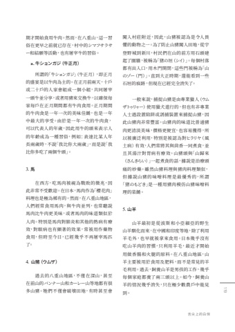 %u671f%u624d%u958b%u59cb%u98df%u7528%u725b%u8089%u3002%u7136%u800c%uff0c%u5728%u516b%u91cd%u5c71%uff0c%u9019%u4e00%u7fd2%u4fd7%u5728%u66f4%u65e9%u4e4b%u524d%u5c31%u5df2%u5b58%u5728%uff0c%u6751%u4e2d%u7684%u30b7%u30de%u30d5%u30b5%u30e9%u30b5%u30fc%u548c%u7d50%u9858%u7b49%u6d3b%u52d5%uff0c%u4e5f%u6709%u5c60%u5bb0%u725b%u7684%u7fd2%u4fd7%u3002a. %u725b%u30b7%u30e7%u30f3%u30ac%u30b8%uff08%u725b%u6b63%u6708%uff09%u6240%u8b02%u7684%u300c%u725b%u30b7%u30e7%u30f3%u30ac%u30b8%u300d%uff08%u725b%u6b63%u6708%uff09%uff0c%u5373%u6b63%u6708%u7684%u76db%u5bb4%u662f%u4ee5%u725b%u8089%u70ba%u4e3b%u7684%u3002%u5728%u6b63%u6708%u524d%u5169%u5929%uff0c%u5341%u6236%u6216%u4e8c%u5341%u6236%u7684%u4eba%u5bb6%u6703%u7d44%u6210%u4e00%u500b%u5c0f%u7d44%uff0c%u5171%u540c%u5c60%u5bb0%u4e00%u982d%u725b%u4e26%u5206%u4eab%uff0c%u6216%u8005%u7528%u8c6c%u4f86%u4ea4%u63db%u725b%uff0c%u4ee5%u78ba%u4fdd%u6bcf%u5bb6%u6bcf%u6236%u5728%u6b63%u6708%u671f%u9593%u90fd%u6709%u725b%u8089%u98df%u7528%u3002%u6b63%u6708%u671f%u9593%u7684%u725b%u8089%u98df%u662f%u4e00%u5e74%u4e00%u6b21%u7684%u7f8e%u5473%u4f73%u991a%uff0c%u4e5f%u662f%u4e00%u5e74%u4e2d%u6700%u5927%u7684%u4eab%u53d7%u3002%u7531%u65bc%u662f%u4e00%u5e74%u4e00%u6b21%u7684%u725b%u8089%u98df%uff0c%u53ef%u4ee5%u4ee3%u8868%u4eba%u7684%u5e74%u6b72%uff0c%u56e0%u6b64%u7528%u725b%u7684%u982d%u4f86%u8868%u793a%u4eba%u7684%u5e74%u9f61%u6210%u70ba%u4e00%u7a2e%u7fd2%u4fd7%uff0c%u4f8b%u5982%uff1a%u8868%u9054%u6bd4%u67d0%u4eba%u5e74%u9577%u5169%u6b72%u6642%uff0c%u4e0d%u8aaa%u300c%u6211%u6bd4%u4f60%u5927%u5169%u6b72%u300d%uff0c%u800c%u662f%u8aaa%u300c%u6211%u6bd4%u4f60%u591a%u5403%u4e86%u5169%u500b%u725b%u982d%u300d%u30023. %u99ac%u5728%u897f%u65b9%uff0c%u5403%u99ac%u8089%u88ab%u8996%u70ba%u6230%u6557%u7684%u5fb5%u5146%uff0c%u56e0%u6b64%u975e%u5e38%u4e0d%u53d7%u6b61%u8fce%u3002%u5728%u65e5%u672c%uff0c%u99ac%u8089%u4f5c%u70ba%u300c%u6afb%u82b1%u8089%u300d%u6599%u7406%u4e5f%u662f%u6975%u70ba%u7a00%u6709%u7684%u3002%u7136%u800c%uff0c%u5728%u516b%u91cd%u5c71%u5730%u5340%uff0c%u4eba%u5011%u7d93%u5e38%u98df%u7528%u99ac%u8089%uff0c%u8207%u725b%u8089%u4e26%u5217%uff0c%u4e5f%u5e38%u807d%u8aaa%u99ac%u8089%u6bd4%u725b%u8089%u66f4%u7f8e%u5473%uff0c%u6216%u8005%u99ac%u8089%u7684%u5473%u9053%u985e%u4f3c%u65bc%u4eba%u8089%u3002%u7279%u5225%u662f%u99ac%u8089%u5c0d%u80ba%u708e%u548c%u5176%u4ed6%u7684%u71b1%u75c5%u6709%u7642%u6548%uff0c%u5c0d%u773c%u75c5%u4e5f%u6709%u986f%u8457%u7684%u6548%u679c%uff0c%u5e38%u88ab%u7528%u4f5c%u85e5%u7269%u98df%u7528%uff0c%u4f46%u6642%u81f3%u4eca%u65e5%uff0c%u5df2%u7d93%u5e7e%u4e4e%u4e0d%u518d%u5c60%u5bb0%u99ac%u5339%u4e86%u30024. %u5c71%u8c6c%uff08%u30a6%u30e0%u30b6%uff09%u904e%u53bb%u7684%u516b%u91cd%u5c71%u5730%u5340%uff0c%u4e0d%u50c5%u5728%u6df1%u5c71%uff0c%u751a%u81f3%u5728%u524d%u5c71%u7684%u30d0%u30f3%u30ca%u30fc%u5c71%u548c%u30ab%u30fc%u30ec%u30fc%u5c71%u7b49%u5730%u90fd%u6709%u5f88%u591a%u5c71%u8c6c%u3002%u7260%u5011%u4e0d%u50c5%u6703%u7834%u58de%u7530%u5730%uff0c%u6709%u6642%u751a%u81f3%u6703%u95d6%u5165%u6751%u838a%u9644%u8fd1%uff0c%u56e0%u6b64%uff0c%u5c71%u8c6c%u88ab%u8a8d%u70ba%u662f%u4ee4%u4eba%u754f%u61fc%u7684%u52d5%u7269%u4e4b%u4e00%u3002%u70ba%u4e86%u9632%u6b62%u5c71%u8c6c%u95d6%u5165%u7530%u5730%uff0c%u5f9e%u5b87%u767b%u91ce%u57ce%u5230%u65b0%u5ddd%uff0c%u6751%u6c11%u5011%u5728%u5c71%u7684%u524d%u65b9%u7528%u77f3%u982d%u5efa%u8d77%u4e86%u570d%u7246%uff0c%u88ab%u7a31%u70ba%u300c%u732a%u306e%u57a3%uff08%u30b7%u30a4%uff09%u300d%u3002%u6bcf%u500b%u6751%u843d%u90fd%u6709%u51fa%u5165%u53e3%uff0c%u7528%u6728%u9580%u958b%u9589%uff0c%u9019%u4e9b%u9580%u88ab%u7a31%u70ba%u300c%u5c71%u306e%u30be%u30fc%uff08%u9580%uff09%u300d%u3002%u76f4%u5230%u5927%u6b63%u6642%u671f%uff0c%u9084%u80fd%u770b%u5230%u4e00%u4e9b%u77f3%u57a3%u7684%u75d5%u8de1%uff0c%u4f46%u73fe%u5728%u5df2%u7d93%u5b8c%u5168%u6d88%u5931%u4e86%u3002%u4e00%u822c%u4f86%u8aaa%uff0c%u6355%u6349%u5c71%u8c6c%u662f%u7531%u5c08%u696d%u7375%u4eba%uff08%u30a6%u30e0%u30b6%u30c8%u30a5%u30ea%u30e3%u30fc%uff09%u4f7f%u7528%u7375%u72ac%u9032%u884c%u7684%uff0c%u4f46%u4e5f%u6709%u975e%u5c08%u696d%u4eba%u58eb%u904e%u8a2d%u7f6e%u9677%u9631%u6216%u8a98%u6355%u88dd%u7f6e%u4f86%u6355%u6349%u5c71%u8c6c%uff0c%u56e0%u6b64%u5c71%u8c6c%u8089%u975e%u5e38%u8c50%u5bcc%u3002%u5c71%u8c6c%u8089%u7684%u5473%u9053%u6bd4%u666e%u901a%u8c6c%u8089%u66f4%u6e05%u6de1%u7f8e%u5473%uff0c%u50f9%u683c%u66f4%u4fbf%u5b9c%uff0c%u4e5f%u5bb9%u6613%u7372%u5f97%uff0c%u6240%u4ee5%u88ab%u5ee3%u6cdb%u5229%u7528%uff0c%u7279%u5225%u662f%u88ab%u8a8d%u70ba%u5c0d%u30d2%u30e9%u30ea%u30e4%uff08%u98a8%u571f%u75c5%uff09%u6709%u6548%uff0c%u4eba%u5011%u5e38%u5c07%u5176%u8207%u8334%u9999%u4e00%u540c%u716e%u98df%uff0c%u4e26%u4e14%u5176%u6e6f%u6c41%u5c0d%u80c3%u75c5%u6709%u7642%u6548%u3002%u5c71%u8c6c%u982d%u8207%u300c%u5c71%u6b78%u4f86%uff08%u3055%u3093%u304d%u3089%u3044%uff09%u300d%u4e00%u8d77%u716e%u98df%u7684%u8a71%uff0c%u64da%u8aaa%u662f%u6cbb%u7642%u982d%u75db%u7684%u5999%u85e5%u3002%u96d6%u7136%u5c71%u8c6c%u6599%u7406%u8207%u8c6c%u8089%u6599%u7406%u985e%u4f3c%uff0c%u4f46%u64da %u8aaa%u5c71%u8c6c%u7684%u5473%u564c%u6599%u7406%u662f%u6700%u512a%u79c0%u7684%uff0c%u6240%u8b02%u300c%u732a%u306e%u3082%u3069%u304d%u300d%u662f%u4e00%u7a2e%u7528%u8c6c%u8089%u6a21%u4eff%u5c71%u8c6c%u5473%u564c%u6599%u7406%u7684%u83dc%u991a%u30025. %u5c71%u7f8a%u5c71%u7f8a%u6700%u521d%u662f%u5f9e%u6ce2%u65af%u548c%u5c0f%u4e9e%u7d30%u4e9e%u7684%u91ce%u751f%u5c71%u7f8a%u99b4%u5316%u800c%u4f86%uff0c%u5728%u4e2d%u570b%u548c%u5370%u5ea6%u7b49%u5730%uff0c%u9664%u4e86%u5229%u7528%u7f8a%u6bdb%u5916%uff0c%u4e5f%u65e9%u5c31%u88ab%u62ff%u4f86%u98df%u7528%u3002%u65e5%u672c%u5e7e%u4e4e%u6c92%u6709%u5403%u5c71%u7f8a%u8089%u7684%u7fd2%u6163%uff0c%u53ea%u5229%u7528%u7f8a%u6bdb%uff0c%u6700%u8fd1%u624d%u958b%u59cb%u7528%u505a%u9999%u8178%u548c%u706b%u817f%u7684%u539f%u6599%u3002%u5728%u516b%u91cd%u5c71%u5730%u5340%uff0c%u5c71%u7f8a%u4e3b%u8981%u88ab%u7528%u65bc%u98df%u7528%u53ca%u80a5%u6599%uff0c%u800c%u4e0d%u662f%u5e38%u898b%u7684%u7f8a%u6bdb%u5229%u7528%u3002%u904e%u53bb%uff0c%u98fc%u990a%u5c71%u7f8a%u662f%u7537%u5b6