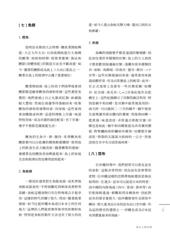 ( %u4e03 ) %u9b5a%u985e1. %u9c39%u9b5a%u5f9e%u660e%u6cbb%u672b%u671f%u5230%u5927%u6b63%u6642%u671f%uff0c%u9c39%u9b5a%u696d%u958b%u59cb%u8208%u8d77%u3002%u5927%u6b63%u4e5d%u5e74%u5de6%u53f3%uff0c%u77f3%u57a3%u5cf6%u958b%u59cb%u9032%u884c%u5927%u898f%u6a21%u7684%u9c39%u696d%uff0c%u5230%u662d%u548c%u6642%u671f%uff0c%u7d93%u71df%u8005%u6fc0%u589e%uff0c%u6f01%u6cd5%u548c%u9c39%u7bc0(%u5373%u9c39%u9b5a%u4e7e)%u7684%u88fd%u9020%u65b9%u6cd5%u4e5f%u4e0d%u65b7%u6539%u9032%uff0c%u5982%u4eca%uff0c%u512a%u8cea%u7684%u9c39%u7bc0%u6210%u70ba%u5cf6%u4e0a%u4e09%u5927%u51fa%u53e3%u7522%u54c1%u4e4b%u4e00%uff0c%u9c39%u696d%u5728%u5cf6%u4e0a%u7684%u7d93%u6fdf%u4e2d%u5360%u64da%u4e86%u91cd%u8981%u5730%u4f4d%u3002%u9c39%u696d%u958b%u59cb%u5f8c%uff0c%u5cf6%u4e0a%u7684%u5b69%u5b50%u5011%u653e%u5b78%u5f8c%u6703%u5230%u9c39%u7bc0%u88fd%u9020%u5ee0%u62ff%u9c39%u9b5a%u7684%u982d%u548c%u9aa8%u982d%uff0c%u9019%u4e9b%u90fd%u662f%u514d%u8cbb%u7684%u3002%u4ed6%u5011%u6703%u63d2%u4e0a%u65e5%u4e4b%u4e38%u65d7%u6216%u7d05%u65d7%uff0c%u7948%u79b1%u6f01%u8239%u5927%u8c50%u6536%uff0c%u7136%u5f8c%u5728%u6d77%u908a%u7b49%u5f85%u6f01%u8239%u56de%u4f86%uff0c%u6536%u96c6%u9c39%u9b5a%u7684%u982d%u548c%u9aa8%u982d%u5e36%u56de%u5bb6%u3002%u56de%u5bb6%u5f8c%uff0c%u9019%u4e9b%u6771%u897f%u6703%u52a0%u9e7d%u505a%u6210%u6599%u7406%uff0c%u9019%u9053%u6599%u7406%u914d%u4e0a%u7518%u85f7%uff0c%u5473%u9053%u7279%u5225%u7f8e%u5473%uff0c%u6210%u70ba%u7518%u85f7%u7684%u6700%u4f73%u914d%u83dc%u3002%u6709%u4e86%u7518%u85f7%uff0c%u5e7e%u4e4e%u4e0d%u9700%u8981%u82b1%u9322%u5c31%u80fd%u751f%u6d3b%u3002%u9c39%u9b5a%u7684%u751f%u9b5a%u7247%u3001%u5375%u3001%u8179%u8089%u3001%u7099%u70e4%u9c39%u9b5a%u548c%u9c39%u7bc0%u90fd%u53ef%u4ee5%u4ee5%u4f4e%u5ec9%u7684%u50f9%u683c%u8f15%u9b06%u8cfc%u8cb7%uff0c%u4f7f%u5f97%u5cf6%u4e0a%u7684%u98f2%u98df%u751f%u6d3b%u5927%u5e45%u6539%u5584%u3002%u96a8%u8457%u9c39%u696d%u7684%u767c%u5c55%uff0c%u990a%u8c6c%u696d%u4e5f%u56e0%u9c39%u9b5a%u9aa8%u800c%u8208%u76db%u8d77%u4f86%uff0c%u5cf6%u4e0a%u7684%u5bb6%u5ead%u751f%u6d3b%u548c%u7d93%u6fdf%u81ea%u7136%u4e5f%u8b8a%u5f97%u5bcc%u88d5%u8d77%u4f86%u30022. %u9b5a%u677f%u985e%u4e00%u822c%u5c45%u6c11%u901a%u5e38%u628a%u751f%u9b5a%u505a%u6210%u6e6f%uff0c%u6216%u7099%u70e4%u5f8c%u518d%u505a%u6210%u6e6f%u98df%u7528%uff0c%u5e73%u6642%u5f88%u96e3%u5403%u5230%u523a%u8eab%u6216%u716e%u7269%u7b49%u83dc%u991a%u3002%u9b5a%u677f%u9019%u7a2e%u98df%u7269%u53ea%u6709%u5728%u7279%u6b8a%u5834%u5408%u624d%u80fd%u4eab%u7528%uff0c%u9019%u6a23%u7684%u6642%u4ee3%u6301%u7e8c%u4e86%u5f88%u4e45%u3002%u7136%u800c%uff0c%u96a8%u8457%u6f01%u696d%u767c%u5c55%uff0c%u5982%u4eca%u6bd4%u8d77%u6c96%u7e69%u672c%u5cf6%u6216%u65e5%u672c%u672c%u571f%u7684%u4efb%u4f55%u5730%u65b9%uff0c%u9019%u88e1%u7684%u4eba%u5011%u80fd%u66f4%u5962%u4f88%u5730%u4eab%u7528%u9b5a%u985e%u548c%u9b5a%u677f%uff0c%u7279%u5225%u662f%u9b5a%u677f%u7684%u88fd%u4f5c%u65b9%u6cd5%u4e5f%u6709%u4e86%u5f88%u5927%u7684%u6539%u9032%uff0c%u5982%u4eca%u516b%u91cd%u5c71%u9b5a%u677f%u540d%u8072%u5927%u566a%uff0c%u9084%u51fa%u53e3%u5230%u5bae%u53e4%u548c%u90a3%u9738%u30023. %u8c9d%u985e%u5cf6%u5dbc%u7684%u5468%u570d%u5e7e%u4e4e%u90fd%u662f%u9060%u6dfa%u7684%u73ca%u745a%u7901%uff0c%u56e0%u6b64%u5c45%u4f4f%u8457%u8a31%u591a%u7a2e%u985e%u7684%u8c9d%u985e%u3002%u5cf6%u4e0a%u7684%u5927%u4eba%u548c%u5b69%u5b50%u90fd%u559c%u6b61%u5230%u6d77%u908a%u64bf%u8c9d%u985e%u3002%u6dfa%u7058%u6709%u5f88%u591a%u7a2e%u985e%u7684%u8c9d%uff0c%u5982%u86e4%u3001%u99ac%u8e44%u86e4%u3001%u5370%u5357%u8c9d%u3001%u8711%u8c9d%u3001%u9162%u8c9d%u3001%u30cb%u30ca%u8c9d%u7b49%u3002%u9019%u4e9b%u8c9d%u985e%u88ab%u64bf%u56de%u4f86%u5f8c%uff0c%u901a%u5e38%u6703%u7528%u4f86%u505a%u6e6f%u6216%u918b%u62cc%u83dc%uff0c%u4f5c%u70ba%u65e5%u5e38%u9910%u684c%u4e0a%u7684%u914d%u83dc%u3002%u6b64%u5916%uff0c%u5728%u6b63%u5f0f%u5bb4%u5e2d%u4e0a%u4e5f%u6703%u6709%u4e00%u4e9b%u8c9d%u985e%u83dc%u991a%uff0c%u5982%u6afb%u8c9d%u3001%u7d05%u8c9d%u6e6f%u3001%u591c%u5149%u8c9d%u3001%u3057%u3083%u3053%u8c9d%u67d3%u7d05%u5f8c%u4f5c%u70ba%u4e7e%u991a%u5448%u4e0a%uff0c%u9019%u4e9b%u7d00%u9304%u986f%u793a%u4e86%u8c9d%u985e%u7684%u5ee3%u6cdb%u5229%u7528%uff0c%u7279%u5225%u662f%u8778%u725b%u548c%u7530%u87ba%uff0c%u662f%u8c9d%u985e%u4e2d%u6700%u5e38%u88ab%u98df%u7528%u7684%u3002%u96e8%u5929%u6642%uff0c%u53ef%u4ee5%u64bf%u5230%u4e8c%u3001%u4e09%u5347%u7684%u8778%u725b%uff0c%u8778%u725b%u88ab%u653e%u5728%u58fa%u88e1%u8b93%u5176%u6392%u51fa%u9ad4%u5167%u7684%u7cde%u4fbf%uff0c%u7136%u5f8c%u8207%u56de%u9109%u4e00%u8d77%u716e%u6e6f%uff0c%u5473%u9053%u6e05%u6de1%uff0c%u975e%u5e38%u9069%u5408%u642d%u914d%u7518%u85f7%uff0c%u7530%u87ba%u4e5f%u662f%u5982%u6b64%u3002%u8778%u725b%u548c%u7530%u87ba%u88ab%u8a8d%u70ba%u5177%u6709%u85e5%u7528%u50f9%u503c%uff0c%u5c0d%u814e%u81df%u75c5%u548c%u809d%u81df%u75c5%u6709%u7642%u6548%u3002%u7530%u87ba%u8981%u4ed4%u7d30%u6e05%u6d17%uff0c%u5c07%u6bbc%u7684%u5c16%u7aef%u90e8%u5206%u62c6%u6389%u7d04%u4e00%u516c%u5206%uff0c%u7136%u5f8c%u6d78%u6ce1%u5728%u6c34%u4e2d%u5145%u5206%u6e05%u6d17%u5f8c%u518d%u716e%u3002( %u516b ) %u6606%u5e03%u5728%u6c96%u7e69%u6599%u7406%u4e2d%uff0c%u6211%u5011%u7d93%u5e38%u53ef%u4ee5%u770b%u898b%u6606%u5e03%u7684%u8eab%u5f71%uff0c%u9019%u9ede%u975e%u5e38%u7279%u5225%uff0c%u56e0%u70ba%u6606%u5e03%u662f%u5bd2%u5e36%u7684%u7522%u7269%uff0c%u5728%u6c96%u7e69%u9019%u6a23%u7684%u4e9e%u71b1%u5e36%u5730%u5340%u61c9%u8a72%u662f%u7121%u6cd5%u53d6%u5f97%u7684%u3002%u5728%u904e%u53bb%uff0c%u6606%u5e03%u53ef%u4ee5%u8aaa%u662f%u65e5%u672c%u7684%u7279%u7522%uff0c%u800c%u4e2d%u570b%u7684%u5167%u9678%u5730%u5340%uff08%u56db%u5ddd%u3001%u96f2%u5357%u3001%u8cb4%u5dde%u7b49%uff09%u7531%u65bc%u8ddd%u6d77%u8f03%u9059%u9060%uff0c%u8f03%u96e3%u53d6%u5f97%u542b%u7898%u98df%u6750%uff0c%u56e0%u6b64%u5c0d%u6606%u5e03%u7684%u9700%u6c42%u91cf%u8f03%u5927%uff0c%u800c%u6c96%u7e69%u4fbf%u66fe%u4f5c%u70ba%u8cbf%u6613%u4e2d%u8f49%u7ad9%uff0c%u5c07%u5927%u91cf%u4f86%u81ea%u65e5%u672c%u7684%u6606%u5e03%u51fa%u53e3%u81f3%u4e2d%u570b%u3002%u4f5c%u70ba%u9019%u6bb5%u6b77%u53f2%u7684%u907a%u7559%u4e4b%u4e00%uff0c%u6