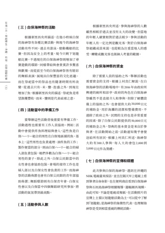 ( %u4e09 ) %u767d%u4fdd%u6d77%u795e%u796d%u7684%u6d3b%u52d5%u6839%u64da%u65b0%u91cc%u660c%u592e%u6240%u63cf%u8ff0%uff0c%u5728%u4ed6%u5c0f%u6642%u5019%u767d%u4fdd%u7684%u6d77%u795e%u796d%u6709%u5404%u7a2e%u6bd4%u8cfd%u6d3b%u52d5%uff0c%u8207%u73fe%u4eca%u7684%u6d77%u795e%u796d%u6d3b%u52d5%u6709%u4e9b%u4e0d%u540c%u3002%u904e%u53bb%u6709%u6e38%u6cf3%u3001%u767c%u52d5%u6a5f%u8239%u7684%u6bd4%u8cfd%uff0c%u4f46%u56e0%u70ba%u5b89%u5168%u4e0a%u7684%u8003%u91cf%uff0c%u73fe%u4eca%u53ea%u5269%u4e0b%u5212%u9f8d%u8239%u6bd4%u8cfd%u3002%u4e0d%u904e%u73fe%u5728%u7684%u767d%u4fdd%u6d77%u795e%u796d%u5247%u589e%u52a0%u4e86%u5c0b%u5bf6%u904a%u6232%u7684%u74b0%u7bc0%uff0c%u540c%u6a23%u5e36%u7d66%u8207%u6703%u8cb4%u8cd3%u8a31%u591a%u9a5a%u559c%u8207%u6b61%u6a02%u3002%u800c%u5f9e%u524d%u81f3%u4eca%u7684%u767d%u4fdd%u6d77%u795e%u796d%u7686%u6709%u7cbe%u5f69%u7684%u821e%u8e48%u8868%u6f14%uff0c%u5c55%u73fe%u51fa%u767d%u4fdd%u8c50%u5bcc%u7684%u6587%u5316%u5e95%u860a%u3002%u800c%u5728%u796d%u7940%u7576%u4e2d%u7684%u796d%u54c1%u4e5f%u6709%u96a8%u8457%u6642%u9593%u6709%u6240%u6539%u8b8a%uff0c%u5f9e%u904e%u53bb%u53ea%u6709%u3001%u7c73%u3001%u9e7d%u3001%u6ce1%u76db%u4e4b%u5916%uff0c%u5230%u73fe%u5728%u589e%u52a0%u4e86%u9b5a%uff0c%u6839%u64da%u65b0%u91cc%u660c%u592e%u7684%u63cf%u8ff0%uff0c%u796d%u7940%u9b5a%u662f%u5e0c%u671b%u6f01%u7372%u8c50%u6536%uff0c%u800c%u7c73%u3001%u9e7d%u5247%u662f%u4ee3%u8868%u795b%u90aa%u4e4b%u610f%u3002( %u56db ) %u6d3b%u52d5%u7576%u4e2d%u7684%u6e96%u5099%u5de5%u4f5c%u8981%u8209%u8fa6%u9019%u4e9b%u6d3b%u52d5%u80cc%u5f8c%u9700%u8981%u6709%u6e96%u5099%u5de5%u4f5c%uff0c%u6d3b%u52d5%u904e%u7a0b%u4e5f%u9700%u8981%u6709%u5de5%u4f5c%u4eba%u54e1%u5354%u52a9%u3002%u4f8b%u5982%uff1a%u6d3b%u52d5%u4e2d%u6703%u63d0%u4f9b%u70b8%u9b5a%u6599%u7406%u7d66%u8207%u6703%u4eba%uff0c%u9019%u4e9b%u9b5a%u662f%u767d%u4fdd%u30cf%u30fc%u30ea%u30fc%u7d44%u5408%u7684%u7537%u6027%u5728%u767d%u4fdd%u5730%u5340%u6355%u7684%u9b5a%u3002%u57fa%u672c%u4e0a%uff0c%u9019%u4e9b%u7537%u6027%u4e5f%u8ca0%u8cac%u8655%u7406%u3001%u6cb9%u70b8%u9b5a%u7684%u5de5%u4f5c%uff1b%u88fd%u4f5c%u4fbf%u7576%u7684%u90e8%u5206%uff0c%u5247%u7531%u767d%u4fdd%u30cf%u30fc%u30ea%u30fc%u7d44%u5408%u7684%u5a66%u4eba%u90e8%u8ca0%u8cac%u5305%u88dd%uff0c%u5979%u5011%u591a%u6578%u70ba%u767d%u4fdd%u30cf%u30fc%u30ea%u30fc%u7d44%u5408%u7537%u6027%u7684%u59bb%u5b50%u3002%u9664%u6b64%u4e4b%u5916%uff0c%u767d%u4fdd%u516c%u6c11%u9928%u7576%u4e2d%u7684%u5973%u6027%u6703%u4e5f%u6703%u5354%u52a9%u5305%u88dd%u3002%u6703%u5834%u7684%u63a5%u5f85%u5de5%u4f5c%u4e5f%u662f%u5a66%u4eba%u90e8%u4ee5%u53ca%u767d%u4fdd%u5973%u6027%u6703%u8ca0%u8cac%u7684%u5de5%u4f5c%uff0c%u800c%u6d77%u795e%u796d%u7684%u6d3b%u52d5%u4f48%u7f6e%u4e5f%u6703%u6709%u767d%u4fdd%u516c%u6c11%u9928%u7684%u9752%u5e74%u90e8%u5354%u52a9%u4f48%u7f6e%uff1b%u821e%u8e48%u74b0%u7bc0%u5247%u6709%u767d%u4fdd%u9752%u5e74%u6703%u3001%u767d%u4fdd%u5973%u6027%u6703%u4ee5%u53ca%u767d%u4fdd%u7576%u4e2d%u56db%u500b%u821e%u8e48%u7814%u7a76%u6240%u53c3%u52a0%uff0c%u5c07%u6d3b%u52d5%u7684%u6c23%u6c1b%u5e36%u5230%u6700%u9ad8%u9ede%u3002( %u4e94 ) %u6d3b%u52d5%u53c3%u8207%u4eba%u6578%u6839%u64da%u65b0%u91cc%u660c%u592e%u6240%u8ff0%uff0c%u53c3%u8207%u6d77%u795e%u796d%u7684%u4eba%u6578%u96d6%u7136%u76f8%u8f03%u65bc%u904e%u53bb%u4e26%u6c92%u6709%u592a%u5927%u7684%u6539%u8b8a%uff0c%u4f46%u7576%u5730%u7684%u5e74%u8f15%u4eba%u78ba%u5be6%u76f8%u5c0d%u65bc%u904e%u53bb%u8f03%u5c11%uff0c%u53c3%u8207%u6d3b%u52d5%u7684%u5e74%u8f15%u4eba%u6709%u4e00%u5b9a%u6bd4%u4f8b%u662f%u89c0%u5149%u5ba2%uff0c%u5c0d%u65bc%u767d%u4fdd%u6d77%u795e%u796d%u7d44%u7e54%u6210%u54e1%u4f86%u8aaa%uff0c%u4e5f%u5f9e%u8f03%u70ba%u6ce8%u91cd%u7576%u5730%u4eba%u7684%u611f%u53d7%uff0c%u8f49%u8b8a%u6210%u89c0%u5149%u5ba2%u4e5f%u88ab%u7d0d%u5165%u8003%u91cf%u7684%u7bc4%u570d%u3002( %u516d ) %u767d%u4fdd%u6d77%u795e%u796d%u7684%u8cc7%u91d1%u9664%u4e86%u9700%u8981%u4eba%u54e1%u7684%u5354%u52a9%u4e4b%u5916%uff0c%u8209%u8fa6%u6d3b%u52d5%u4e5f%u9700%u8981%u8cc7%u91d1%u7684%u652f%u6301%u3002%u6839%u64da%u4e0a%u6751%u771f%u4ec1%u89e3%u8aaa%uff0c%u5728%u767d%u4fdd%u6d77%u795e%u796d%u7684%u6d3b%u52d5%u5834%u5730%u4e2d%uff0c%u67092016%u5e74%u7531%u653f%u5e9c%u6240%u8208%u5efa%u7684%u5ec1%u6240%u548c%u6dbc%u4ead%uff0c%u653f%u5e9c%u7684%u89d2%u8272%u5728%u767d%u4fdd%u6d77%u795e%u796d%u96d6%u7136%u4e0d%u662f%u76f4%u63a5%u4ecb%u5165%u548c%u53c3%u8207%uff0c%u4f46%u9664%u4e86%u786c%u9ad4%u8a2d%u5099%u4e0a%u7684%u5354%u52a9%u4e4b%u5916%uff0c%u4e5f%u6703%u63d0%u4f9b%u5927%u7d0430,000%u65e5%u5143%u7684%u88dc%u52a9%u91d1%uff0c%u7528%u65bc%u6d77%u7058%u7684%u6e05%u6f54%u548c%u6574%u5099%u8cbb%u7528%u3002%u4e0d%u904e%u9664%u4e86%u653f%u5e9c%u4e4b%u5916%uff0c%u6c11%u9593%u7684%u652f%u6301%u4e5f%u662f%u975e%u5e38%u91cd%u8981%u7684%u56e0%u7d20%uff0c%u9664%u4e86%u767d%u4fdd%u516c%u6c11%u9928%u63d0%u4f9b%u768450,000%u65e5%u5143%u7684%u88dc%u52a9%u91d1%u4e4b%u5916%uff0c%u796d%u5178%u7684%u57fa%u672c%u8cc7%u91d1%u662f%u4f86%u81ea%u65bc%u53c3%u8207%u8005%uff0c%u5728%u6d3b%u52d5%u958b%u59cb%u4e4b%u524d%uff0c%u6d3b%u52d5%u901a%u77e5%u5e7e%u4e4e%u6703%u767c%u9001%u7d66%u6240%u6709%u5c45%u6c11%uff0c%u6839%u64da%u4e0a%u6751%u771f%u4ec1%u6240%u8ff0%uff0c%u6d77%u795e%u796d%u5927%u7d04%u6709300%u4eba%u53c3 %u8207%uff0c%u6bcf%u4eba %u5927 %u7d04 %u6703%u53052,000%u52303,000%u65e5%u5143%u4f5c%u70ba%u8cc0%u79ae%u3002( %u4e03 ) %u767d%u4fdd%u6d77%u795e%u796d%u7684%u5ba3%u50b3%u548c%u5a92%u9ad4%u6b64%u6b21%u53c3%u8207%u767d%u4fdd%u7684%u6d77%u795e%u796d%uff0c%u9047%u5230%u5728%u6c96%u7e69%u7684NHK%u96fb%u8996%u81fa%u4f86%u63a1%u8a2a%uff0c%u4e26%u4e14%u5728%u9694%u5929%u65e9%u4e0a%u96fb%u8996%u4e0a%u770b%u5230%u7b46%u8005%u81ea%u8eab%u8eab%u5f71%uff0c%u4e5f%u5728%u4fbf%u5229%u5546%u5e97%u770b%u5230%u767d%u4fdd%u6d77%u795e%u796d%u8207%u77f3%u57a3%u5cf6%u6d77%u795e%u796d%u76f8%u95dc%u5831%u5c0e%uff0c%u7bc7%u5e45%u9817%u5177%u898f%u6a21%u3002%u7531%u6b64%u53ef%u77e5%uff0c%u4e0d%u8ad6%u662f%u96fb%u8996%u6216%u5831%u7d19%uff0c%u5728%u6d3b%u52d5%u7167%u7247%u7684%u5ba3%u50b3%u4e0a%u4e3b%u8981%u4ee5%u5212%u9f8d%u8239%u6d3b%u52d