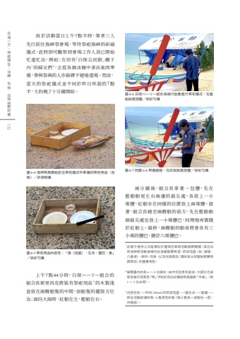 %u5716 6-4 %u6d77%u795e%u796d%u5178%u958b%u59cb%u524d%u5728%u796d%u7940%u5100%u5f0f%u4e2d%u6e96%u5099%u7684%u796d%u7940%u7528%u54c1%uff08%u542b%u9b5a%uff09%uff0f%u8a31%u5bb9%u6995%u651d%u5716 6-5 %u796d%u7940%u7528%u54c1%u5167%u5bb9%u542b%uff1a%u300c%u9152%uff08%u6ce1%u76db%uff09%u3001%u751f%u7c73%u3001%u9e7d%u5df4%u3001%u9999%u300d%uff0f%u5f90%u5f69%u52fb%u651d%u5716 6-6 %u767d%u4fdd%u30cf%u30fc%u30ea%u30fc%u7d44%u5408%u9577%u7e5e%u884c%u8239%u96bb%u9032%u884c%u796d%u7940%u5100%u5f0f%uff0c%u5728%u85cd%u8239%u8239%u5c3e%u653e%u9e7d%uff0f%u5f90%u5f69%u52fb%u651d%u5716 6-7 %u540c%u5716 6-6 %u796d%u5100%u904e%u7a0b%uff0c%u5728%u7d05%u8239%u8239%u5c3e%u653e%u9e7d%uff0f%u5f90%u5f69%u52fb%u651d%u4e0a%u53487%u9ede44%u5206%u6642%uff0c%u767d%u4fdd%u30cf%u30fc%u30ea%u30fc%u7d44%u5408%u7684%u7d44%u5408%u9577%u65b0%u91cc%u660c%u514b%u5c07%u88dd%u6709%u796d%u7940%u7528%u54c13%u7684%u6728%u88fd%u6dfa%u76d2%u653e%u5728%u5169%u8258%u8239%u96bb%u7684%u4e2d%u9593%uff0c%u800c%u8239%u96bb%u7684%u64fa%u653e%u65b9%u4f4d%u70ba%uff1a%u9762%u5411%u5927%u6d77%u6642%uff0c%u7d05%u8239%u5728%u5de6%uff0c%u85cd%u8239%u5728%u53f3%u3002%u5169%u5206 %u9418 %u5f8c%uff0c%u7d44%u5408%u9577%u62ff %u8457 %u4e00 %u5305 %u9e7d%uff0c%u5148 %u5728%u85cd%u8239%u8239%u5c3e%u5de6%u53f3%u5169%u908a%u7684%u6700%u5c16%u8655%uff0c%u5404%u653e %u4e0a%u4e00%u5c0f%u5806%u9e7d%uff0c%u7d05%u8239%u4ea6%u5728%u540c%u6a23%u7684%u4f4d%u7f6e%u653e%u4e0a%u5169%u5806%u9e7d%u3002%u63a5%u8457%uff0c%u7d44%u5408%u9577%u7e5e%u81f3%u5169%u8258%u8239%u7684%u524d%u65b9%uff0c%u5148%u5728%u85cd%u8239%u8239%u982d%u6700%u5c16%u8655%u4e5f%u653e%u4e0a%u4e00%u5c0f%u5806%u9e7d%u5df4%uff0c%u540c%u7406%u5730%u518d%u5be6%u8e10%u65bc%u7d05%u8239%u4e0a%u3002%u6700%u7d42%uff0c%u5169%u8258%u8239%u7684%u8239%u8eab%u5c07%u6703%u5404%u6709%u4e09%u5c0f%u5806%u7684%u9e7d%u5df4%uff0c%u7e3d%u8a08%u516d%u5806%u9e7d%u5df4%u3002%u6545%u65bc%u6d3b%u52d5%u7576%u65e5%u4e0a%u53487%u9ede%u534a%u6642%uff0c%u7b46%u8005%u4e09%u4eba%u5148%u884c%u524d%u5f80%u6d77%u795e%u796d%u6703%u5834%uff0c%u7b49%u5f85%u796d%u7940%u6d77%u795e%u7684%u7948%u798f%u5100%u5f0f%uff0c%u6b64%u6642%u5373%u53ef%u89c0%u5bdf%u5230%u6703%u5834%u5de5%u4f5c%u4eba%u54e1%u5df2%u958b%u59cb%u5fd9%u9032%u5fd9%u51fa%uff0c%u4f8b%u5982%uff1a%u5728%u5370%u6709%u300c%u767d%u4fdd%u516c%u6c11%u9928%u300d%u68da%u5b50%u51671%u7684%u5a66%u5973%u50112%uff0c%u6b63%u5f9e%u5404%u500b%u51b0%u6876%u4e2d%u62ff%u51fa%u6771%u897f%u6e96%u5099%uff0c%u53c3%u8207%u796d%u5178%u7684%u4eba%u4ea6%u7d61%u7e79%u4e0d%u7d55%u5730%u9032%u5834%u3002%u7136%u800c%uff0c%u7576%u5929%u7684%u796d%u7940%u5100%u5f0f%u4e26%u4e0d%u540c%u65bc%u6628%u65e5%u6240%u8aaa%u76847%u9ede%u534a%uff0c%u5927%u7d04%u665a%u4e86%u5341%u5206%u9418%u958b%u59cb%u3002%u6b64%u68da%u5b50%u63d0%u4f9b%u4e4b%u529f%u80fd%u985e%u4f3c%u65bc%u81fa%u7063%u5728%u8209%u8fa6%u6d3b%u52d5%u670d%u52d9%u6ac3%u6aaf%u3002%u5176%u5728%u767d%u4fdd%u6d77%u795e%u796d%u6d3b%u52d5%u6703%u5834%u5167%u626e%u6f14%u8457%u8ca9%u8ce3%u5564%u9152%u3001%u7409%u7403%u6ce1%u76db%uff08%u5982%uff1a%u8acb%u798f%u3001%u516b%u91cd%u6cc9%uff09%u3001%u98f2%u6599%u3001%u5403%u98df%u3001%u4ee5%u53ca%u514c%u63db%u734e%u54c1%uff08%u7051%u5f69%u7d19%uff06%u5212%u9f8d%u8239%u7af6%u8cfd%u5f97%u734e%u968a%u4f0d%uff09%u7684%u91cd%u8981%u89d2%u8272%u3002%u670d%u52d9%u81fa%u5167%u7d04%u6709 6 %uff5e 9 %u4f4d%u5a66%u5973%uff0c%u7531%u4e2d%u5e74%u53ca%u9752%u5e74%u7d44%u6210%uff0c%u5927%u90e8%u5206%u4e5f%u8eab%u7a7f%u80cc%u5f8c%u5370%u6709%u9ed1%u8272%u300c%u796d%u300d%u5b57%u7684%u7d05%u8272%u65e5%u5f0f%u50b3%u7d71%u796d%u5178%u670d%u98fe%u300c%u534a%u88ab%u300d%uff08%u96641 %uff5e 2 %u4f4d%u672a%u7a7f%uff09%u3002%u5167%u5bb9%u5305%u542b%uff1a%u4e00%u676f%u7d04 300ml %u7684%u7409%u7403%u6ce1%u76db%u3001%u4e00%u76e4%u751f%u7c73%u3001%u4e00%u76e4%u9e7d%u3001%u4e00%u689d%u5728%u6d3b%u52d5%u524d%u6355%u7684%u9b5a%u30016 %u96bb%u9ed1%u8272%u7684%u9999%uff08%u6bcf%u4e09%u96bb%u70ba%u4e00%u7d44%u9ecf%u5728%u4e00%u8d77%uff0c%u5171%u5169%u7d44%uff09%u3002123132%u5728%u6d77%u4e00%u65b9%u3001%u57a3%u8d77%u7de3%u751f%uff1a%u6c96%u7e69%u00b7%u77f3%u57a3%u00b7%u767d%u4fdd%u7530%u91ce%u7d00%u5be6