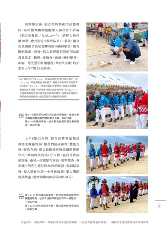 %u5716 6-19 %u7051%u5b8c%u796d%u7940%u7528%u7684%u7c73%u53ca%u9152%u7684%u796d%u5100%u5f8c%uff0c%u7d44%u5408%u9577%u518d%u6b21%u8f49%u8eab%u63d0%u9192%u7d44%u54e1%u5011%u958b%u59cb%u96d9%u624b%u7948%u798f%uff0f%u5f90%u5f69%u52fb%u651d%u5716 6-20 %u7948%u798f%u7d50%u675f%u5f8c%uff0c%u7d44%u5408%u9577%u53ca%u8239%u54e1%u5011%u76f8%u4e92%u97a0%u8eac%u81f4%u8b1d%uff0f%u5f90%u5f69%u52fb%u651d6-196-20%u4ee5%u4e0b%u91dd%u5c0d%u6587%u4e2d%u300c%u306a%u3063%u3057%u3087%u30fc%u300d%u9019%u500b%u65e5%u6587%u62fc%u97f3%uff0c%u9032%u884c%u88dc%u5145%u8aaa%u660e%u3002%u300c%u306a%u3063%u3057%u3087%u30fc%u300d%uff0c%u53ea%u662f%u7b46%u8005%u5728%u6d3b%u52d5%u7576%u4e0b%uff0c%u5c07%u7d44%u5408%u9577%u8aaa%u7684%u767c%u97f3%u8a18%u9304%u4e0b%u4f86%uff1b%u95dc%u65bc%u300c%u306a%u3063%u3057%u3087%u30fc%u300d%u9019%u500b%u62fc%u97f3%u7684%u4e3b%u8981%u610f%u601d%u3001%u6216%u771f%u6b63%u7684%u542b%u7fa9%uff0c%u7b46%u8005%u4ea6%u5c1a%u4e0d%u6e05%u695a%u3001%u4ecd%u5f85%u8003%u8b49%u3002%u63db%u53e5%u8a71%u8aaa%uff0c%u6587%u4e2d%u7684%u300c%u306a%u3063%u3057%u3087%u30fc%u300d%uff0c%u53ea%u662f%u7b46%u8005%u53d6%u7528%u5404%u500b%u5e73%u5047%u540d%u7d44%u5408%u8d77%u4f86%u7684%u767c%u97f3%uff0c%u5c1a%u7121%u6cd5%u8003%u8b49%u662f%u5426%u771f%u6709%u9019%u500b%u62fc%u97f3%u8a5e%u5f59%u3001%u6216%u662f%u5176%u662f%u5426%u5177%u6709%u5be6%u8cea%u7684%u610f%u601d%u30024%u56de%u5230%u968a%u4f0d%u5f8c%uff0c%u7d44%u5408%u9577 %u5c07 %u796d%u7940%u7528%u54c1 %u6574 %u7406%u597d%uff0c%u518d%u6b21 %u5fae %u5fae%u8f49%u982d%u63d0%u9192%u773e%u4eba%u518d%u6b21%u5408%u5341%u7948%u798f%uff08%u7d44%u5408%u9577%u6703%u8aaa%uff1a%u300c%u306a%u3063%u3057%u3087%u30fc 4%u300d%uff09%uff0c%u904e%u7a0b%u5927%u7d04%u6301%u7e8c20%u79d2%uff08%u6703%u9577%u7d04%u57285%u79d2%u6642%u7d50%u675f%uff09%u3002%u6700%u5f8c%uff0c%u7d44%u5408%u9577%u53ca%u526f%u7d44%u5408%u9577%u7ad9%u8d77%u8f49%u8eab%u9762%u5411%u5169%u6392%u8239%u54e1%uff0c%u76f8%u4e92%u97a0%u8eac%u81f4%u8b1d%u3002%u800c%u5f8c%uff0c%u7d44%u5408%u9577%u5c07%u88dd%u6709%u796d%u7940%u7528%u54c1%u7684%u6dfa%u76d2%u6536%u8d70%u3002%u6700%u7d42%uff0c%u5f9e%u63d2%u9999%u3001%u7948%u798f%u3001%u7e5e%u884c%u8239%u8eab%u3001%u7948%u798f%u2026%u7b49%u5b8c%u6574%u7684%u796d%u5100%u904e%u7a0b%uff0c%u5171%u8a086%u5206%u9418%uff0c%u7d04%u65bc%u7576%u5929%u4e0a%u53487%u9ede53%u5206%u7d50%u675f%u3002%u4e0a%u53488%u9ede02%u5206 %u6642%uff0c%u7d44 %u5408 %u9577 %u5e36%u9818 %u773e %u8239 %u54e1%u79fb%u81f3%u4e3b%u821e%u81fa%u81f4%u8a5e%uff0c%u8239%u54e1%u5011%u6392%u6210%u5169%u5217%uff1a%u85cd%u8272%u5728%u5f8c%uff0c%u7d05%u8272%u5728%u524d%uff0c%u7d44%u5408%u9577%u5247%u7ad9%u5728%u968a%u4f0d%u6700%u524d%u6392%u7684%u4e2d%u592e%u3002%u81f4%u8a5e%u6642%u9577%u7d04%u70ba1%u520619%u79d2%u3002%u7d44%u5408%u9577%u81f4%u8a5e%u7d50%u675f%u5f8c%uff0c%u7531%u53e6%u4e00%u4f4d%u982d%u9aee%u82b1%u7070%u767d%u3001%u9aee%u578b%u5fae%u79bf%u3001%u8eab%u5f62%u77ee%u5c0f%u7684%u5148%u751f%u9032%u884c%u7d0450%u79d2%u7684%u81f4%u8a5e%u3002%u81f4%u8a5e%u7d50%u675f%u5f8c%uff0c%u6bcf%u4eba%u5c07%u6703%u5206%u5230%u4e00%u5c0f%u676f%u7948%u798f%u9152%uff0c%u773e%u4eba%u96a8%u5373%u5c07%u5176%u98f2%u76e1%u3002%u6b64%u6642%u6d3b%u52d5%u6642%u9593%u7d04%u70ba8%u9ede08%u5206%u3002%u5716 6-21 %u5728%u796d%u7940%u5100%u5f0f%u7d50%u675f%u5f8c%uff0c%u7d44%u5408%u9577%u5e36%u9818%u7d44%u54e1%u5011%u5230%u821e%u81fa%u524d%u81f4%u8a5e%uff0c%u4e5f%u8868%u793a%u6d3b%u52d5%u5373%u5c07%u9032%u884c%u5230%u4e0b%u4e00%u500b%u968e%u6bb5%uff0f%u5f90%u5f69%u52fb%u651d%u5716 6-22 %u5728%u7d44%u5408%u9577%u81f4%u8a5e%u5b8c%u5f8c%uff0c%u63db%u6210%u5176%u4ed6%u8207%u6703%u8005%u81f4%u8a5e%uff0f%u5f90%u5f69%u52fb%u651d6-216-22135%u767d%u8272%u7684%u6c99%u3001%u7e7d%u7d1b%u7684%u69f3%u3001%u61f7%u8457%u5982%u540c%u6d77%u6d6a%u6e67%u8d77%u7684%u6b61%u9a30%uff0c%u4e00%u8d77%u5212%u5411%u90a3%u6e5b%u85cd%u7684%u6d77%u5427%uff01%uff1a%u8b93%u6885%u96e8%u5b63%u7159%u6d88%u96f2%u6563%u7684%u767d%u4fdd%u6d77%u795e%u796d