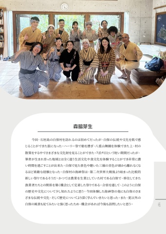 167%u4eca%u56de%u3001%u77f3%u57a3%u5cf6%u306e%u767d%u4fdd%u6751%u3092%u8a2a%u308c%u308b%u306e%u306f%u521d%u3081%u3066%u3060%u3063%u305f%u304c%u3001%u767d%u4fdd%u306e%u4f1d%u7d71%u3084%u6587%u5316%u3092%u808c%u3067%u611f%u3058%u308b%u3053%u3068%u304c%u3067%u304d%u305f%u65c5%u306b%u306a%u3063%u305f%u3002%u30cf%u30fc%u30ea%u30fc%u796d%u3067%u8239%u3092%u6f15%u304e%u3001%u516b%u91cd%u5c71%u821e%u8e0a%u3092%u4f53%u9a13%u3067%u304d%u305f%u4e0a%u3001%u6751%u306e%u6563%u7b56%u3092%u3059%u308b%u4e2d%u3067%u3055%u307e%u3056%u307e%u306a%u6587%u5316%u8ca1%u3092%u898b%u308b%u3053%u3068%u304c%u3067%u304d%u305f%u30023%u6cca4%u65e5%u3068%u3044%u3046%u77ed%u3044%u671f%u9593%u3060%u3063%u305f%u304c%u3001%u7b46%u8005%u304c%u751f%u307e%u308c%u80b2%u3063%u305f%u5730%u57df%u3068%u306f%u5168%u304f%u9055%u3046%u751f%u6d3b%u6587%u5316%u3084%u98df%u6587%u5316%u3092%u4f53%u9a13%u3059%u308b%u3053%u3068%u304c%u3067%u304d%u975e%u5e38%u306b%u6fc3%u3044%u6642%u9593%u3092%u904e%u3054%u3059%u3053%u3068%u304c%u51fa%u6765%u305f%u3002%u767d%u4fdd%u3067%u898b%u305f%u666f%u8272%u3084%u8074%u3044%u305f%u4e09%u7dda%u306e%u97f3%u8272%u304c%u982d%u304b%u3089%u96e2%u308c%u306a%u304f%u306a%u308b%u307b%u3069%u7d20%u6575%u306a%u7d4c%u9a13%u3068%u306a%u3063%u305f%u3002%u767d%u4fdd%u6751%u306e%u6d77%u795e%u796d%u306f%u3001%u7b2c%u4e8c%u6b21%u4e16%u754c%u5927%u6226%u5f8c%u3088%u308a%u59cb%u307e%u3063%u305f%u6bd4%u8f03%u7684%u65b0%u3057%u3044%u796d%u308a%u3067%u3042%u308b%u305d%u3046%u3060%u3002%u304b%u3064%u3066%u306f%u8fb2%u696d%u3092%u751f%u696d%u3068%u3057%u3066%u3044%u305f%u6751%u3067%u3042%u308b%u767d%u4fdd%u3067%u3001%u79fb%u4f4f%u3057%u3066%u304d%u305f%u6f01%u696d%u8005%u305f%u3061%u3068%u306e%u95a2%u4fc2%u3092%u7bc9%u304f%u6a5f%u4f1a%u3068%u3057%u3066%u5b9a%u7740%u3057%u305f%u796d%u308a%u3067%u3042%u308b%u3002%u5408%u5bbf%u3092%u901a%u3057%u3066%u3001%u3053%u306e%u3088%u3046%u306b%u767d%u4fdd%u306e%u6b74%u53f2%u3084%u6587%u5316%u306b%u3064%u3044%u3066%u5c11%u3057%u77e5%u308c%u305f%u3088%u3046%u306b%u601d%u3046%u3002%u4eca%u56de%u4f53%u9a13%u3057%u305f%u6d77%u795e%u796d%u306e%u4ed6%u306b%u3082%u767d%u4fdd%u306e%u3055%u307e%u3056%u307e%u306a%u4f1d%u7d71%u3084%u6587%u5316%u3001%u305d%u3057%u3066%u6b74%u53f2%u306b%u3064%u3044%u3066%u3088%u308a%u6df1%u304f%u5b66%u3093%u3067%u3044%u304d%u305f%u3044%u3068%u601d%u3063%u305f%u3002%u307e%u305f%u3001%u590f%u4ee5%u5916%u306e%u767d%u4fdd%u306e%u98a8%u666f%u3082%u898b%u3066%u307f%u305f%u3044%u3068%u5f37%u304f%u601d%u3063%u305f%u305f%u3081%u3001%u6a5f%u4f1a%u304c%u3042%u308c%u3070%u4eca%u5f8c%u3082%u8a2a%u554f%u3057%u305f%u3044%u3068%u601d%u3046%u3002%u68ee%u8107%u82bd%u751f