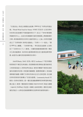 %u300c%u793e%u5340%u81ea%u6cbb%u300d%u548c%u6210%u7acb%u76f8%u95dc%u81ea%u6cbb%u7d44%u7e54%u30022000%u5e74%u5728%u300c%u4e16%u754c%u81ea%u7136%u57fa%u91d1%u6703%u300d%uff08World Wide Fund for Nature%uff0cWWF%uff09%u7684%u652f%u6301%uff0c%u4ee5%u53ca%u767d%u4fdd%u6751%u6751%u6c11%u548c%u793e%u5340%u7d44%u7e54%u7684%u4e0d%u65b7%u5021%u8b70%u548c%u52aa%u529b%u4e0b%uff0c%u6210%u7acb%u4e86%u300cWWF%u73ca%u745a%u7901%u4fdd%u8b77%u7814%u7a76%u4e2d%u5fc3%u300d%uff0c%u4e26%u6210%u529f%u5730%u63a8%u7ffb%u539f%u5148%u8981%u5728%u73ca%u745a%u7901%u4e0a%u8208%u5efa%u6a5f%u5834%u7684%u65b9%u6848%uff0c%u5c07%u65b0%u6a5f%u5834%u79fb%u81f3%u767d%u4fdd%u6751%u5317%u908a%u7684%u9678%u5730%u4e0a%u3002%u4e4b%u5f8c%uff0c%u767d%u4fdd%u6751%u9678%u7e8c%u6210%u7acb%u4e86%u300c%u767d%u4fdd%u9b5a%u6e67%u304f%u6d77%u4fdd%u5168%u5354%u8b70%u4f1a%u300d%u3001%u300c%u767d%u4fdd%u30cf%u30fc%u30ea%u30fc%u7d44%u5408%u300d%u3001%u300c%u590f%u82b1NPO%u6cd5%u4eba%u5718%u9ad4%u300d%u3001%u300c%u767d%u4fdd%u9752%u5e74%u6703%u300d%u2026%u7b49%u793e%u5340%u81ea%u6cbb%u7d44%u7e54%uff0c%u4ee5%u53ca%u5236%u5b9a%u4e86%u300c%u767d%u4fdd%u6751%u3086%u3089%u3066%u3044%u304f%u61b2%u7ae0%u300d%uff0c%u6301%u7e8c%u5730%u63a8%u52d5%u73ca%u745a%u7901%u4fdd%u80b2%u3001%u50b3%u7d71%u6587%u5316%u8207%u6280%u85dd%u50b3%u627f%u3001%u6d77%u6d0b%u8207%u77f3%u6eec%u74b0%u5883%u6559%u80b2%u53ca%u5730%u65b9%u7522%u696d%u632f%u8208%u7b49%u4e8b%u52d9%uff0c%u5275%u9020%u53ef%u4ee5%u8b93%u6751%u6c11%u5b89%u5c45%u6a02%u696d%u7684%u767d%u4fdd%u6751%u3002Zolli%u548cHealy%uff082012%uff09%u8a8d%u70ba%uff0c%u97cc%u6027%uff08resilience%uff09%u4e0d%u662f%u6d88%u6975%u9762%u5c0d%u74b0%u5883%u7684%u4e0d%u78ba%u5b9a%u6027%u8207%u98a8%u96aa%uff0c%u800c%u662f%u7a4d%u6975%u63a1%u53d6%u7b56%u7565%u4e26%u904b%u7528%u5275%u65b0%u6216%u5de5%u5177%u4f86%u589e%u52a0%u80fd%u529b%uff1b%u540c%u6642%u4ed6%u5011%u4e5f%u6307%u51fa%uff0c%u97cc%u6027%u7684%u5be6%u8e10%u4e0d%u662f%u5c07%u7cfb%u7d71%u56de%u5fa9%u5230%u6539%u8b8a%u524d%u7684%u72c0%u614b%uff0c%u800c%u662f%u8981%u6301%u7e8c%u8abf%u6574%u3001%u9069%u61c9%u74b0%u5883%u8b8a%u5316%u3002%u56e0%u70ba%u6a5f%u5834%u8208%u5efa%u7684%u8b70%u984c%uff0c%u885d%u64ca%u4e86%u767d%u4fdd%u6751%u7684%u539f%u672c%u751f%u6d3b%u65b9%u5f0f%u8207%u7a7a%u9593%uff0c%u4f46%u4e5f%u8b93%u767d%u4fdd%u6751%u601d%u7d22%u5982%u4f55%u5efa%u69cb%u4ee5%u300c%u793e%u5340%u70ba%u57fa%u790e%u300d%uff08community-based%uff09%u7684%u97cc%u6027%u3002%u767d%u4fdd%u6751%u7684%u97cc%u6027%uff0c%u662f%u4e00%u7a2e%u793e%u5340%u9762%u81e8%u885d%u64ca%u6642%u7684%u518d%u5b78%u7fd2%u8207%u518d%u7d44%u7e54%u4e4b%u80fd%u529b%uff0c%u66f4%u662f%u4e00%u7a2e%u900f%u904e%u5730%u65b9%u8ce6%u6b0a%uff08empowerment%uff09%u8207%u80fd%u529b%u5efa%u69cb%uff08capacity building%uff09%u7684%u9014%u5f91%uff0c%u4f86%u8f49%u5316%u70ba%u5177%u6709%u5f48%u6027%u3001%u61c9%u5c0d%u6027%u8207%u4fee%u5fa9%u6027%u7684%u80fd%u529b%uff0c%u4ee5%u964d%u4f4e%u6216%u6e1b%u7de9%u885d%u64ca%u5c0d%u793e%u5340%u5e36%u4f86%u7684%u7834%u58de%u548c%u640d%u5931%u3002176%u5728%u6d77%u4e00%u65b9%u3001%u57a3%u8d77%u7de3%u751f%uff1a%u6c96%u7e69%u00b7%u77f3%u57a3%u00b7%u767d%u4fdd%u7530%u91ce%u7d00%u5be6