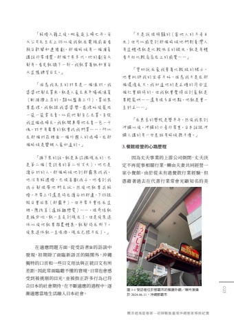 %u300c%u7d50%u5a5a%u5165%u7c4d%u4e4b%u5f8c%uff0c%u505a%u5bb6%u5ead%u4e3b%u5a66%u4e03%u5e74%uff0c%u6bcf%u5929%u516c%u53f8%u5148%u751f%u53bb%u4e0a%u73ed%u4ee5%u5f8c%u6211%u5c31%u5728%u96fb%u8996%u524d%u9762%u770b%u671d%u65e5%u65b0%u805e%u548c%u9023%u7e8c%u5287%uff0c%u90a3%u500b%u6642%u5019%u6709%u4e00%u500b%u6f14%u54e1%u8b1b%u8a71%u975e%u5e38%u6e05%u695a%uff0c%u90a3%u500b%u5341%u6731%u5e78%u4ee3%uff0c%u5979%u7684%u5287%u6bcf%u5929%u90fd%u6709%uff0c%u770b%u5b8c%u5c31%u63db%u4e0b%u4e00%u90e8%uff0c%u6211%u5c31%u62ff%u8457%u7d19%u548c%u7b46%u6bcf%u5929%u9019%u6a23%u7df4%u7fd2%u65e5%u6587%u3002%u300d%u300c%u56e0%u70ba%u6211%u5148%u751f%u7684%u6751%u91cc%u662f%u4e00%u500b%u6f01%u6751%uff0c%u6211%u5a46%u5a46%u5979%u90fd%u53bb%u8cb7%u9b5a%uff0c%u5c31%u662f%u4eba%u5bb6%u53bb%u9b5a%u5e02%u5834%u558a%u6f01%u8ca8%uff08%u525b%u6355%u6488%u4e0a%u5cb8%u7684%uff0c%u985e%u4f3c%u76e4%u5546%u5de5%u4f5c%uff09%uff0c%u8cb7%u56de%u4f86%u8981%u8655%u7406%uff0c%u6211%u5c31%u8ddf%u6211%u5a46%u5a46%u5b78%uff0c%u8655%u7406%u597d%u5f8c%u88dd%u6210%u4e00%u888b%u4e00%u888b%u62ff%u53bb%u8ce3%uff0c%u4ee5%u524d%u5979%u90fd%u81ea%u5df1%u53bb%u8cb7%uff0c%u81ea%u5f9e%u6211%u9019%u500b%u5ab3%u5a66%u53bb%uff0c%u6211%u5c31%u958b%u8eca%u5e36%u5979%u53bb%u8ce3%u4e00%u5305%u4e00%u5343%u584a%uff0c%u6751%u4e2d%u6709%u9700%u8981%u7684%u5c31%u6703%u627e%u6211%u5011%u8cb7%u2026%u2026%uff0c%u6240%u4ee5%u5728%u90a3%u500b%u6751%u838a%u88e1%u9762%u4e00%u500b%u5916%u570b%u4eba%u7684%u5ab3%u5a66%uff0c%u5728%u90a3%u500b%u6642%u5019%u662f%u883b%u88ab%u4eba%u5bb6%u77e5%u9053%u7684%u3002%u300d%u300c%u63a5%u4e0b%u4f86%u7684%u8a71%uff0c%u5c31%u662f%u518d%u8a8d%u8b58%u73fe%u5728%u7684%u3001%u4e5f%u662f%u7b2c%u4e8c%u500b%uff08%u53d7%u8a2a%u8005%u7684%u7b2c%u4e8c%u4efb%u4e08%u592b%uff09%uff0c%u4ed6%u4e5f%u662f%u8b80%u8c37%u6751%u7684%u4eba%uff0c%u90a3%u500b%u6642%u5019%u4ed6%u5230%u90a3%u9738%u4f86%u627e%u6211%uff0c%u4ed6%u6c92%u6709%u7d50%u904e%u5a5a%uff0c%u4e5f%u5f88%u559c%u6b61%u5b69%u5b50%uff0c%u4ed6%u770b%u5230%u6211%u5b69%u5b50%u90fd%u5f88%u5e36%u4ed6%u5011%u53bb%u73a9%u3002%u7136%u5f8c%u4ed6%u5c31%u8981%u6c42%u7d50%u5a5a%uff0c%u5e73%u5e38%u5de5%u4f5c%u9084%u662f%u5f85%u5728%u8b80%u8c37%u6751%u90a3%u908a%uff0c%u4e0b%u73ed%u8ddf%u5047%u65e5%u6703%u56de%u4f86%uff08%u90a3%u9738%u5e02%uff09%uff0c%u4f46%u5e73%u5e38%u4e0d%u6703%u4f4f%u5728%u9019%u88e1%u3002%u61c9%u8a72%u7b97%uff08%u9060%u8ddd%u96e2%u6200%u611b%uff09%u2026%u2026%uff0c%u5f88%u5947%u602a%u5c31%u662f%u7de3%u5206%u5566%uff0c%u5c31%u4e00%u76f4%u8d70%u5230%u73fe%u5728%u4e86%uff0c%u4f46%u662f%u5f8c%u4f86%u9000%u4f11%u4ee5%u5f8c%u4ed6%u5c31%u8981%u52d9%u8fb2%u7a2e%u83dc%uff0c%u5c31%u90fd%u5f85%u5728%u9109%u4e0b%u3002%u5f8c%u4f86%u9000%u4f11%u5c31%u4e00%u76f4%u559d%u9152%uff0c%u73fe%u5728%u5df2%u7d93%u4e0d%u5728%u4e86%u3002%u300d%u5728%u9069%u61c9%u554f%u984c%u65b9%u9762%uff0c%u5f9e%u53d7%u8a2a%u8005B%u7684%u8a2a%u8ac7%u4e2d%u767c%u73fe%uff0c%u521d%u671f%u9664%u4e86%u9762%u81e8%u65b0%u8a9e%u8a00%u7684%u9694%u95a1%u5916%uff0c%u6c96%u7e69%u7368%u7279%u7684%u53e3%u97f3%u548c%u4e00%u4e9b%u65e5%u6587%u7528%u6cd5%u8207%u6b63%u7d71%u65e5%u6587%u6709%u6240%u5dee%u8ddd%uff0c%u56e0%u6b64%u5e38%u9762%u81e8%u807d%u4e0d%u61c2%u7684%u7a98%u5883%uff0c%u65e5%u5e38%u4e5f%u6703%u611f%u53d7%u5230%u88ab%u6311%u5254%u7684%u76ee%u5149%uff0c%u4e26%u88ab%u6307%u6b63%u8a31%u591a%u884c%u70ba%u5df2%u7b26%u5408%u65e5%u672c%u7684%u793e%u6703%u671f%u5f85%uff0c%u5728%u4e0d%u65b7%u9069%u61c9%u7684%u904e%u7a0b%u4e2d%uff0c%u9010%u6f38%u9069%u61c9%u7576%u5730%u751f%u6d3b%u878d%u5165%u65e5%u672c%u793e%u6703%u3002%u300c%u4e0d%u662f%u8aaa%u5f88%u660e%u986f%u7684%uff08%u7576%u5730%u4eba%u7684%u4e0d%u5584%u76ee%u5149%uff09%u4f46%u53ef%u4ee5%u611f%u53d7%u5230%u90a3%u500b%u6642%u5019%u4ed6%u5011%u5c0d%u81fa%u7063%u4eba%u6709%u9019%u7a2e%u55ef%u5c31%u662f%u6bd4%u8f03%u4f4e%u52a3%u7684%u773c%u5149%uff0c%u5c31%u662f%u6709%u7a2e%u770b%u4e0d%u8d77%u6bd4%u8f03%u9ad8%u9ad8%u5728%u4e0a%u7684%u611f%u89ba%u2026%u2026%u300d%u300c%u8b6c%u5982%u8aaa%u5728%u5bb6%u6211%u7a7f%u8457%u6bd4%u8f03%u77ed%u7684%u88d9%u5b50%uff0c%u4ed6%u6703%u6279%u8a55%u6211%u7684%u5750%u59ff%u4e0d%u597d%uff0c%u56e0%u70ba%u6211%u4e0d%u662f%u5728%u90a3%u500b%u74b0%u5883%u9577%u5927%uff0c%u6211%u77e5%u9053%u4ed6%u7684%u662f%u6b63%u78ba%u7684%u7b26%u5408%u9019%u500b%u793e%u6703%u671f%u5f85%u7684%uff0c%u4f46%u6211%u5c31%u6703%u89ba%u5f97%u56de%u5230%u5bb6%u5c31%u662f%u8981%u8f15%u9b06%u554a%u2026%u2026%u9084%u6709%u5f88%u591a%u5176%u4ed6%u9ede%uff0c%u4ed6%u5c31%u662f%u6703%u4e00%u76f4%u7cfe%u6b63%u2026%u2026%u300d%u300c%u5728%u6771%u4eac%u7684%u5b78%u6821%u662f%u5b78%u534a%u5e74%uff0c%u7136%u5f8c%u6211%u4f86%u5230%u6c96%u7e69%u4ee5%u5f8c%uff0c%u6c96%u7e69%u7684%u53e3%u97f3%u975e%u5e38%u91cd%uff0c%u65e5%u672c%u8a71%u8ddf%u6c96%u7e69%u4eba%u8b1b%u7684%u6709%u4e00%u4e9b%u5dee%u8ddd%u6709%u6642%u5019%u807d%u4e0d%u61c2%u3002%u300d%u56e0%u70ba%u4e08%u592b%u4e8b%u696d%u7684%u4e0a%u6e38%u516c%u53f8%u5012%u9589%uff0c%u4e08%u592b%u6c7a%u5b9a%u4e0d%u518d%u5f9e%u4e8b%u76f8%u95dc%u884c%u696d%uff0c%u8f49%u7531%u592b%u59bb%u5171%u540c%u7d93%u71df%u4e00%u5bb6%u5c0f%u9910%u9928%u3002%u7531%u65bc%u5f9e%u672a%u6709%u904e%u9910%u98f2%u884c%u696d%u7d93%u9a57%uff0c%u4f46%u6191%u85c9%u8457%u904e%u53bb%u5728%u4ee3%u66f8%u884c%u696d%u5e38%u6703%u5149%u9867%u77e5%u540d%u7684%u7f8e%u5716 1-1 %u53d7%u8a2a%u8005%u4f4d%u65bc%u90a3%u9738%u5e02%u7684%u9910%u5ef3%u5916%u89c0%uff0f%u9673%u541f%u6eb1%u651d%u65bc 2024.06.11%uff0c%u6c96%u7e69%u90a3%u9738%u5e023.%u9910%u9928%u7d93%u71df%u7684%u5fc3%u8def%u6b77%u7a0b023%u98c4%u6d0b%u904e%u6d77%u662f%u5ba2%u5bb6%u2015%u521d%u63a2%u6230%u5f8c%u81fa%u7063%u6c96%u7e69%u5ba2%u5bb6%u79fb%u6c11%u7d00%u5be6