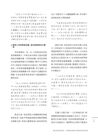 %u300c%u6211%u5152%u5b50%u5973%u5152%u4e5f%u90fd%u4e0d%u63a5%u6211%u7684%u5de5%u4f5c%u2026%u2026%uff0c%u90a3%u500b%u5e97%uff08%u66fe%u7d93%u7d93%u71df%u81fa%u7063%u9910%u9928%u7684%u5e97%uff09%u6211%u5df2%u7d93%u6709%u670b%u53cb%u53bb%u505a%u5317%u6d77%u9053%u624b%u6253%u854e%u9ea5%u9eb5%u4e86%uff0c%u4ee5%u524d%u7684%u62db%u724c%u88ab%u5305%u8d77%u4f86%uff0c%u73fe%u5728%u5eda%u623f%u5df2%u7d93%u901a%u901a%u90fd%u4ea4%u7d66%u4ed6%u4e86%uff0c%u4e3b%u8981%u4e5f%u662f%u4ed6%u5728%u7d93%u71df%u3002%u6211%u73fe%u5728%u4e3b%u8981%u90fd%u662f%u5728%u505a%u5718%u9ad4%u7684%uff0c%u5728%u90a3%u9738%u5e02%u5340%u4f60%u5011%u73fe%u5728%u5403%u98ef%u7684%u9019%u9593%uff0c%u5e73%u5e38%u65c5%u884c%u793e%u6703%u8ddf%u6211%u806f%u7d61%uff0c%u6709%u81fa%u7063%u7684%u904a%u5ba2%u5c31%u6703%u5e36%u5718%u4f86%u6211%u9019%u88e1%u5403%u98ef%uff0c%u73fe%u5728%u6211%u5c31%u662f%u7528%u6c96%u7e69%u7684%u98df%u6750%u505a%u706b%u934b%u3002%u300d%u53d7%u8a2a%u8005%u64c1%u6709%u4e00%u5152%u4e00%u5973%uff0c%u5c0f%u6642%u5019%u662f%u7531%u53d7%u8a2a%u8005%u7684%u5abd%u5abd%u5e36%u5927%uff0c%u5e73%u6642%u5728%u5bb6%u4e2d%u8207%u5b69%u5b50%u8aaa%u7684%u662f%u95a9%u5357%u8a9e%u53ca%u5076%u723e%u593e%u96dc%u4e00%u4e9b%u5ba2%u8a9e%u8a5e%u5f59%uff0c%u800c%u53d7%u8a2a%u8005%u5247%u4ee5%u65e5%u8a9e%u548c%u4ed6%u5011%u9032%u884c%u65e5%u5e38%u6e9d%u901a%uff0c%u5e7e%u4e4e%u4e0d%u592a%u4f7f%u7528%u4e2d%u6587%uff0c%u56e0%u6b64%u5b69%u5b50%u7684%u8a9e%u8a00%u4ee5%u65e5%u8a9e%u70ba%u4e3b%uff0c%u5c0d%u65bc%u95a9%u5357%u8a9e%u53ca%u4e00%u4e9b%u5ba2%u5bb6%u8a5e%u5f59%u50c5%u807d%u5f97%u61c2%uff0c%u4f46%u4e0d%u6703%u8aaa%u3002%u5973%u5152%u5247%u56e0%u70ba%u5230%u81fa%u7063%u8b80%u5927%u5b78%uff0c%u56e0%u6b64%u4e2d%u6587%u6e9d%u901a%u6c92%u6709%u554f%u984c%uff0c%u5728%u5bb6%u4e5f%u6703%u8207%u53d7%u8a2a%u8005%u7528%u4e2d%u6587%u6e9d%u901a%u7df4%u7fd2%u4ee5%u907f%u514d%u5fd8%u8a18%u3002%u300c%u5b69%u5b50%u5c0f%u7684%u6642%u5019%uff0c%u5abd%u5abd%u4f86%u5e6b%u6211%u5e36%u4ed6%u5011%uff0c%u6240%u4ee5%u5b69%u5b50%u6703%u807d%u61c2%u81fa%u7063%u8a71%uff08%u95a9%u5357%u8a9e%uff09%uff0c%u4ed6%u5011%u4e5f%u77e5%u9053%u6709%u5ba2%u5bb6%u8a9e%uff0c%u6709%u6642%u5019%u6211%u5abd%u5abd%u4e5f%u6703%u8ddf%u4ed6%u5011%u8b1b%uff0c%u807d%u5f97%u61c2%u4e00%u9ede%u9ede%u4f46%u5927%u90e8%u5206%u807d%u7684%u9084%u662f%u95a9%u5357%u8a9e%u8ddf%u83ef%u8a9e%u6bd4%u8f03%u591a%u2026%u2026%u3002%u6211%u5152%u5b50%u53ea%u6703%u807d%u4e0d%u6703%u8b1b%uff0c%u4f46%u6211%u5973%u5152%u56e0%u70ba%u5979%u56de%u81fa%u7063%u5ff5%u66f8%uff0c%u5979%u5ff5%u4e86%u5169%u5e74%u7684%u4e2d%u6587%u7136%u5f8c%u5728%u6210%u5927%u7684%u4e2d%u6587%u7cfb%uff0c%u6240%u4ee5%u5979%u6703%u8b1b%u4e2d%u6587%uff0c%u73fe%u5728%u56de%u4f86%u90fd%u6703%u8ddf%u6211%u8b1b%u4e2d%u6587%uff0c%u5979%u60f3%u7df4%u7fd2%u6015%u81ea%u5df1%u5fd8%u8a18%u3002%u300d%u98f2%u98df%u65b9%u9762%uff0c%u53d7%u8a2a%u8005%u5f9e%u5c0f%u770b%u5abd%u5abd%u716e%u7684%u83dc%u5c31%u662f%u5ba2%u5bb6%u83dc%uff0c%u56e0%u6b64%u5e73%u6642%u7121%u8ad6%u662f%u5979%u6216%u8005%u5979%u7684%u5abd%u5abd%u5728%u505a%u98ef%u65b9%u9762%uff0c%u7686%u662f%u4ee5%u81fa%u7063%u5ba2%u5bb6%u53e3%u5473%u7684%u5bb6%u5e38%u83dc%u70ba%u4e3b%uff0c%u56e0%u6b64%u5b69%u5b50%u5341%u5206%u9069%u61c9%u81fa%u7063%u53e3%u5473%uff0c%u5176%u4e2d%u6885%u5e72%u6263%u8089%u66f4%u662f%u5b69%u5b50%u5011%u7684%u6700%u611b%u3002%u300c%u5ba2%u5bb6%u83dc%u56e0%u70ba%u6211%u5f9e%u5c0f%u5c31%u770b%u6211%u5abd%u5abd%u505a%u7684%u90fd%u662f%u5ba2%u5bb6%u83dc%u3002%u90a3%u500b%u6885%u5e72%u7122%u8089%uff0c%u6885%u5e72%u8ddf%u8089%u672b%u53bb%u84b8%uff0c%u6885%u5e72%u83dc%u5207%u7247%u3001%u8c6c%u8089%u5207%u4e00%u5c0f%u584a%u5207%u6210%u8089%u672b%u2026%u2026%uff0c%u653e%u5728%u4e0a%u9762%u53bb%u84b8%uff0c%u84b8%u4e00%u84b8%u5c31%u652a%u958b%u653e%u5728%u98ef%u4e0a%u2026%u2026%u3002%u6211%u5b69%u5b50%u73fe%u5728%u90fd%u56de%u4f86%u90fd%u8981%u6211%u716e%u7d66%u4ed6%u5403%uff0c%u73fe%u5728%u65e5%u672c%u4e0d%u5bb9%u6613%u5403%u5230%u9019%u4e9b%u6771%u897f%u300d%u8a8d%u540c%u65b9%u9762%uff0c%u53d7%u8a2a%u8005%u8868%u793a%u56e0%u70ba%u5916%u570b%u4eba%u7684%u8eab%u5206%uff0c%u5728%u53c3%u52a0%u5b69%u5b50%u5c0f%u6642%u5019%u7684%u5b78%u6821%u6d3b%u52d5%u6642%uff0c%u53ef%u4ee5%u611f%u89ba%u5230%u4ed6%u5011%u4e0d%u592a%u5e0c%u671b%u81ea%u5df1%u53bb%u53c3%u52a0%u3002%u5b50%u5973%u56e0%u70ba%u6210%u9577%u80cc%u666f%u8207%u74b0%u5883%uff0c%u9084%u662f%u5c0d%u65bc%u65e5%u672c%u6bd4%u8f03%u6709%u8a8d%u540c%u4e26%u8a8d%u70ba%u81ea%u5df1%u5c31%u662f%u65e5%u672c%u4eba%uff0c%u5973%u5152%u5247%u56e0%u70ba%u7559%u5b78%u7d93%u6b77%u66fe%u6709%u60f3%u8981%u62ff%u81fa%u7063%u570b%u7c4d%u3001%u5728%u81fa%u7063%u751f%u6d3b%u7684%u5ff5%u982d%uff0c%u4f46%u56e0%u70ba%u73fe%u5728%u5df2%u7d93%u7d50%u5a5a%uff0c%u96a8%u8457%u5b69%u5b50%u7684%u51fa%u751f%uff0c%u56e0%u5bb6%u5ead%u91cd%u5fc3%u7686%u5728%u65e5%u672c%uff0c%u56e0%u6b64%u76ee%u524d%u9084%u662f%u4ee5%u7dad%u6301%u65e5%u672c%u7c4d%u70ba%u4e3b%u3002%u300c%u5c0f%u6642%u5019%u4ed6%u5011%u904b%u52d5%u6703%u3001%u5b78%u6821%u7684%u6d3b%u52d5%u554a%uff0c%u6211%u53ef%u4ee5%u611f%u89ba%u5230%u4ed6%u5011%u90fd%u4e0d%u5927%u611b%u6211%u53bb%u53c3%u52a0%uff0c%u6211%u611f%u89ba%u5566%uff0c%u61c9%u8a72%u662f%u56e0%u70ba%u6211%u4e0d%u662f%u65e5%u672c%u4eba%uff0c%u662f%u5916%u570b%u4eba%uff0c%u61c9%u8a72%u662f%u9019%u6a23%uff0c%u800c%u4e14%u6211%u505a%u9910%u98f2%u4e5f%u5f88%u5fd9%u2026%u2026%u3002%u300d%u300c%u6211%u5973%u5152%u6709%u8aaa%u904e%u60f3%u62ff%u81fa%u7063%u7c4d%uff0c%u4f46%u73fe%u5728%u5df2%u7d93%u7d50%u5a5a%uff0c%u4ed6%u5011%u9084%u6709%u5c0f%u5b69%u4e86%u2026%u2026%u3002%u5f9e%u6210%u5927%u56de%u4f86%u4e4b%u5f8c%u73fe%u5728%u548c%u8001%u516c%u5728%u7a2e%u6709%u6a5f%u83dc%uff0c%u56e0%u70ba%u5bb6%u5ead%u9084%u6709%u751f%u6d3b%uff0c%u5c0f%u5b69%u90fd%u751f%u4e86%uff0c%u6240%u4ee5%u76ee%u524d%u9084%u662f%u4ee5%u65e5%u672c%u7c4d%u70ba%u4e3b%u3002%u300d%u5728%u89aa%u5b50%u4e92%u52d5%u65b9%u9762%uff0c%u4e00%u4eba%u5728%u7570%u5730%u6253%u62fc%uff0c%u7d93%u71df%u9910%u9928%u540c%u6642%u9084%u9700%u62c9%u62d4%u5169%u500b%u5b50%u5973%u9577%u5927%uff0c%u751f