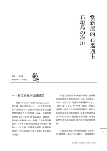%u7576%u65b0%u5c4b%u7684%u77f3%u586d%u9047%u4e0a%u77f3%u57a3%u5cf6%u306e%ufa45%u57a3%u4e00%u3001%u77f3%u586d%u8207%u6d77%u57a3%u4ea4%u7e54%u7de3%u8d77%u9b5a%u6eec%uff0c%u82f1%u6587%u7a31%u4f5c%u300c%u9b5a%u5830%u300d%uff08fishing weirs%uff09%uff0c%u662f%u4e16%u754c%u4e0a%u6700%u53e4%u8001%u7684%u6f01%u6cd5%u4e4b%u4e00%u3002%u81ea%u77f3%u5668%u6642%u4ee3%u4ee5%u4f86%uff0c%u4eba%u985e%u4fbf%u5728%u6cb3%u53e3%u6216%u6d77%u5cb8%u7684%u6f6e%u9593%u5e36%u904b%u7528%u9019%u7a2e%u667a%u6167%u7684%u6355%u9b5a%u65b9%u5f0f%uff08%u674e%u660e%u5112%uff0c2009%uff09%u3002%u9b5a%u6eec%u7684%u5efa%u9020%u6750%u6599%u591a%u53d6%u81ea%u7576%u5730%uff0c%u8af8%u5982%u7384%u6b66%u5ca9%u3001%u73ca%u745a%u7901%u3001%u54be%u5495%u77f3%u3001%u9d5d%u5375%u77f3%u3001%u6728%u6750%u3001%u7af9%u5668%uff0c%u4e43%u81f3%u5f8c%u671f%u7684%u9435%u5668%u7b49%u3002%u5728%u4e16%u754c%u5404%u5730%uff0c%u53ea%u8981%u5177%u5099%u8db3%u5920%u7684%u6f6e%u5dee%u3001%u6750%u6599%u3001%u4eba%u529b%u4ee5%u53ca%u5ee3%u5927%u7684%u7901%u68da%u7b49%u689d%u4ef6%uff0c%u6f01%u6eec%u4fbf%u61c9%u904b%u800c%u751f%u3002%u7576%u4ee5%u77f3%u982d%u70ba%u4e3b%u8981%u6750%u6599%u6642%uff0c%u4fbf%u88ab%u7a31%u70ba%u300c%u77f3%u6eec%u300d%u3002%u77f3%u6eec%u5728%u5404%u5730%u6709%u8457%u4e0d%u540c%u7684%u7a31 %u8b02%u3002%u81fa%u7063 %u6843%u5712%u5e02%u65b0%u5c4b%u6d77%u5ba2%u5730%u5340%u7a31%u5176%u70ba%u300c%u77f3%u586d%u300d%uff08%u5468%u9326%u5b8f%uff0c2016%uff09%uff0c%u800c%u5728%u65e5%u672c%uff0c%u9019%u7a2e%u7d50%u69cb%u88ab%u7a31%u4f5c%u300c%u77f3%u57a3%u300d%u3001%u300c%u6d77%u57a3%u300d%u6216%u300c%u77f3%u5e72%u898b%u300d%uff08%u674e%u660e%u5112%uff0c2009%uff09%u3002%u5efa%u9020%u77f3%u586d%u9700%u8981%u5927%u91cf%u7684%u4eba%u529b%u548c%u9577%u6642%u9593%u7684%u89c0%u5bdf%uff0c%u7814%u7a76%u6c34%u7d0b%u5730%u5f62%u548c%u9b5a%u7fa4%u8ff4%u6e38%u7684%u8def%u5f91%uff0c%u624d%u80fd%u5c07%u5176%u5efa%u9020%u6210%u529f%u3002%u56e0%u6b64%uff0c%u77f3%u586d%u4e0d%u50c5%u662f%u6355%u9b5a%u7684%u8a2d%u65bd%uff0c%u66f4%u662f%u5730%u5340%u6b77%u53f2%u548c%u6587%u5316%u7684%u7e2e%u5f71%uff0c%u6975%u5177%u4fdd%u5b58%u548c%u7814%u7a76%u7684%u50f9%u503c%u3002%u77f3%u586d%u901a%u5e38%u5efa%u9020%u65bc%u9678%u5730%u8207%u6d77%u6d0b%u7684%u4ea4%u532f%u8655%uff0c%u5373%u300c%u6f6e%u9593%u5e36%u300d%uff0c%u5176%u7531%u77f3%u982d%u3001%u54be%u5495%u77f3%u3001%u73ca%u745a%u7901%u7b49%u5929%u8cac%u4efb%u7de8%u8f2f%u2015%u2015%u8a31%u5bb9%u6995%u64b0%u7a3f%u2015%u2015%u674e%u4ec1%u5bcc031%u7576%u65b0%u5c4b%u7684%u77f3%u586d%u9047%u4e0a%u77f3%u57a3%u5cf6%u306e%u6d77%u57a3