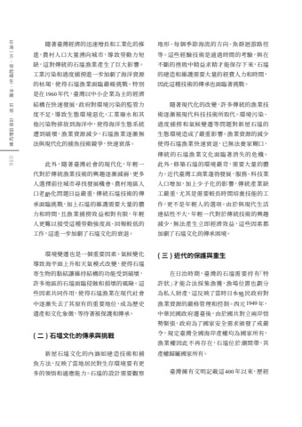 036%u5728%u6d77%u4e00%u65b9%u3001%u57a3%u8d77%u7de3%u751f%uff1a%u6c96%u7e69%u00b7%u77f3%u57a3%u00b7%u767d%u4fdd%u7530%u91ce%u7d00%u5be6%u96a8%u8457%u81fa%u7063%u7d93%u6fdf%u7684%u8fc5%u901f%u589e%u9577%u548c%u5de5%u696d%u5316%u7684%u63a8%u9032%uff0c%u8fb2%u6751%u4eba%u53e3%u5927%u91cf%u6e67%u5411%u57ce%u5e02%uff0c%u5c0e%u81f4%u52de%u52d5%u529b%u77ed%u7f3a%uff0c%u9019%u5c0d%u50b3%u7d71%u7684%u77f3%u586d%u6f01%u696d%u7522%u751f%u4e86%u5de8%u5927%u5f71%u97ff%u3002%u5de5%u696d%u6c61%u67d3%u548c%u904e%u5ea6%u6355%u6488%u9032%u4e00%u6b65%u52a0%u5287%u4e86%u6d77%u6d0b%u8cc7%u6e90%u7684%u67af%u7aed%uff0c%u4f7f%u5f97%u77f3%u586d%u6f01%u696d%u9762%u81e8%u56b4%u5cfb%u6311%u6230%u3002%u7279%u5225%u662f%u57281960%u5e74%u4ee3%uff0c%u81fa%u7063%u4ee5%u4e2d%u5c0f%u4f01%u696d%u70ba%u4e3b%u7684%u7d93%u6fdf%u7d50%u69cb%u5728%u5feb%u901f%u767c%u5c55%uff0c%u653f%u5e9c%u5c0d%u74b0%u5883%u6c61%u67d3%u7684%u76e3%u7ba1%u529b%u5ea6%u4e0d%u8db3%uff0c%u5c0e%u81f4%u751f%u614b%u74b0%u5883%u60e1%u5316%u3002%u5de5%u696d%u5ee2%u6c34%u548c%u5176%u4ed6%u6c61%u67d3%u7269%u6392%u653e%u5230%u6d77%u6d0b%u4e2d%uff0c%u4f7f%u5f97%u6d77%u6d0b%u751f%u614b%u7cfb%u7d71%u906d%u5230%u7834%u58de%uff0c%u6f01%u696d%u8cc7%u6e90%u6e1b%u5c11%uff0c%u77f3%u586d%u6f01%u696d%u9010%u6f38%u7121%u6cd5%u8207%u73fe%u4ee3%u5316%u7684%u6355%u9b5a%u6280%u8853%u7af6%u722d%uff0c%u5feb%u901f%u8870%u843d%u3002%u6b64%u5916%uff0c%u96a8%u8457%u81fa%u7063%u793e%u6703%u7684%u73fe%u4ee3%u5316%uff0c%u5e74%u8f15%u4e00%u4ee3%u5c0d%u65bc%u50b3%u7d71%u6f01%u696d%u6280%u8853%u7684%u8208%u8da3%u9010%u6f38%u6e1b%u5f31%uff0c%u66f4%u591a%u4eba%u9078%u64c7%u524d%u5f80%u57ce%u5e02%u5c0b%u627e%u767c%u5c55%u6a5f%u6703%u3002%u8fb2%u6751%u5730%u5340%u4eba%u53e3%u8001%u9f61%u5316%u554f%u984c%u65e5%u76ca%u56b4%u91cd%uff0c%u50b3%u7d71%u77f3%u586d%u6280%u8853%u7684%u50b3%u627f%u9762%u81e8%u6311%u6230%uff0c%u52a0%u4e0a%u77f3%u586d%u7684%u7dad%u8b77%u9700%u8981%u5927%u91cf%u7684%u9ad4%u529b%u548c%u6642%u9593%uff0c%u4e14%u6f01%u696d%u6355%u6488%u6548%u76ca%u76f8%u5c0d%u6709%u9650%uff0c%u5e74%u8f15%u4eba%u66f4%u96e3%u4ee5%u63a5%u53d7%u9019%u7a2e%u52de%u52d5%u5f37%u5ea6%u9ad8%u3001%u56de%u5831%u8f03%u4f4e%u7684%u5de5%u4f5c%uff0c%u9019%u9032%u4e00%u6b65%u52a0%u5287%u4e86%u77f3%u586d%u6587%u5316%u7684%u8870%u9000%u3002%u74b0%u5883%u8b8a%u9077%u4e5f%u662f%u4e00%u500b%u91cd%u8981%u56e0%u7d20%u3002%u6c23%u5019%u8b8a%u5316%u5c0e%u81f4%u6d77%u5e73%u9762%u4e0a%u5347%u548c%u5929%u6c23%u6a21%u5f0f%u6539%u8b8a%uff0c%u4f7f%u5f97%u77f3%u586d%u5bc4%u751f%u7269%u7684%u9ecf%u7d50%u8b93%u7dad%u6301%u7d50%u69cb%u7684%u529f%u80fd%u53d7%u5230%u7834%u58de%uff0c%u8a31%u591a%u5730%u5340%u7684%u77f3%u586d%u9762%u81e8%u4fb5%u8755%u548c%u640d%u58de%u7684%u98a8%u96aa%u3002%u9019%u4e9b%u56e0%u7d20%u5171%u540c%u4f5c%u7528%uff0c%u4f7f%u5f97%u77f3%u586d%u6f01%u696d%u5728%u73fe%u4ee3%u793e%u6703%u4e2d%u9010%u6f38%u5931%u53bb%u4e86%u5176%u539f%u6709%u7684%u91cd%u8981%u5730%u4f4d%uff0c%u6210%u70ba%u6b77%u53f2%u907a%u7522%u548c%u6587%u5316%u8c61%u5fb5%uff0c%u7b49%u5f85%u8457%u88ab%u4fdd%u8b77%u548c%u50b3%u627f%u3002(%u4e8c) %u77f3%u586d%u6587%u5316%u7684%u50b3%u627f%u8207%u6311%u6230%u65b0%u5c4b%u77f3%u586d%u6587%u5316%u7684%u5167%u6db5%u5982%u5efa%u9020%u6280%u8853%u548c%u6355%u9b5a%u65b9%u6cd5%uff0c%u53cd%u6620%u4e86%u7576%u5730%u5c45%u6c11%u5c0d%u751f%u5b58%u74b0%u5883%u8981%u6709%u66f4%u591a%u7684%u9818%u609f%u548c%u9069%u61c9%u80fd%u529b%u3002%u77f3%u586d%u7684%u8a2d%u8a08%u9700%u8981%u89c0%u5bdf%u5730%u5f62%u3001%u6bcf%u500b%u5b63%u7bc0%u6d77%u6d41%u7684%u65b9%u5411%u3001%u9b5a%u7fa4%u8ff4%u6e38%u8def%u5f91%u7b49%u3002%u9019%u4e9b%u7d93%u9a57%u6280%u8853%u662f%u901a%u904e%u6642%u9593%u7684%u8003%u9a57%uff0c%u8207%u5728%u4e0d%u65b7%u7684%u632b%u6557%u4e2d%u7cbe%u76ca%u6c42%u7cbe%u624d%u80fd%u4fdd%u5b58%u4e0b%u4f86%uff0c%u77f3%u586d%u7684%u5efa%u9020%u548c%u7dad%u8b77%u9700%u8981%u5927%u91cf%u7684%u7d93%u8cbb%u4eba%u529b%u548c%u6642%u9593%uff0c%u56e0%u6b64%u9019%u7a2e%u6280%u8853%u7684%u50b3%u627f%u4e5f%u9762%u81e8%u8457%u6311%u6230%u3002%u96a8%u8457%u73fe%u4ee3%u5316%u7684%u6539%u8b8a%uff0c%u8a31%u591a%u50b3%u7d71%u7684%u6f01%u696d%u6280%u8853%u9010%u6f38%u88ab%u73fe%u4ee3%u79d1%u6280%u6280%u8853%u6240%u53d6%u4ee3%u3002%u74b0%u5883%u6c61%u67d3%u3001%u904e%u5ea6%u6355%u6488%u548c%u6c23%u5019%u8b8a%u9077%u7b49%u554f%u984c%u5c0d%u65b0%u5c4b%u77f3%u586d%u7684%u751f%u614b%u74b0%u5883%u9020%u6210%u4e86%u56b4%u91cd%u5f71%u97ff%u3002%u6f01%u696d%u8cc7%u6e90%u7684%u6e1b%u5c11%u4f7f%u5f97%u77f3%u586d%u6f01%u696d%u5feb%u901f%u8870%u9000%uff0c%u5df2%u7121%u6cd5%u990a%u5bb6%u7cca%u53e3%uff0c%u50b3%u7d71%u7684%u77f3%u586d%u6f01%u696d%u6587%u5316%u9762%u81e8%u8457%u6d88%u5931%u7684%u5371%u6a5f%u3002%u6b64%u5916%uff0c%u4fee%u7bc9%u77f3%u586d%u7684%u74b0%u5883%u56b4%u82db%uff0c%u9700%u8981%u5927%u91cf%u7684%u9ad4%u529b%u3002%u8fd1%u4ee3%u81fa%u7063%u5de5%u5546%u696d%u84ec%u52c3%u767c%u5c55%uff0c%u670d%u52d9%u3001%u79d1%u6280%u696d%u4eba%u53e3%u589e%u52a0%uff0c%u52a0%u4e0a%u5c11%u5b50%u5316%u7684%u5f71%u97ff%uff0c%u50b3%u7d71%u7522%u696d%u7f3a%u5de5%u56b4%u91cd%uff0c%u5c24%u5176%u662f%u9700%u8981%u8f03%u9577%u6642%u9593%u57f9%u990a%u6280%u80fd%u7684%u5de5%u4f5c%uff0c%u66f4%u4e0d%u662f%u5e74%u8f15%u4eba%u7684%u9078%u9805%u3002%u7531%u65bc%u8207%u73fe%u4ee3%u751f%u6d3b%u9023%u7d50%u6027%u4e0d%u5927%uff0c%u5e74%u8f15%u4e00%u4ee3%u5c0d%u65bc%u50b3%u7d71%u6280%u8853%u7684%u8208%u8da3%u6e1b%u5c11%uff0c%u7121%u6cd5%u7522%u751f%u7acb%u5373%u7d93%u6fdf%u6548%u76ca%uff0c%u9019%u4e9b%u56e0%u7d20%u90fd%u52a0%u5287%u4e86%u77f3%u586d%u6587%u5316%u7684%u50b3%u627f%u56f0%u5883%u3002(%u4e09) %u8fd1%u4ee3%u7684%u4fdd%u8b77%u8207%u91cd%u751f%u5728%u65e5%u6cbb%u6642%u671f%uff0c%u81fa%u7063%u7684%u77f3%u586d%u9700%u8981%u6301%u6709%u300c%u7279%u8a31%u72c0%u300d%u624d%u80fd%u5408%u6cd5%u63a1%u96c6%u6f01%u7372%uff0c%u6f01%u5834%u4f4d%u7f6e%u4e5f%u5283%u5206%u70ba%u79c1%u4eba%u8ca1%u7522%uff0c%u9019%u53cd%u6620%u4e86%u7576%u6642%u65e5%u672c%u6b96%u6c11%u653f%u5e9c%u5c0d%u6f01%u696d%u8cc7%u6e90%u7684%u56b4%u683c%u7ba1%u7406%u548c%u63a7%u5236%u3002%u897f%u514
