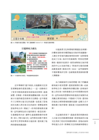 039%u7576%u65b0%u5c4b%u7684%u77f3%u586d%u9047%u4e0a%u77f3%u57a3%u5cf6%u306e%u6d77%u57a3%u5716 2-6 %u65b0%u5c4b%u77f3%u586d%u4f4d%u7f6e%u5716%uff0f%u674e%u4ec1%u5bcc%u7ffb%u651d%u65bc 2024.07.15%uff0c%u65b0%u5c4b%u77f3%u6eec%u6545%u4e8b%u9928%u5716 2-7 %u77f3%u586d%u8207%u5730%u65b9%u5275%u751f%uff0f%u65b0%u5c4b%u611b%u9109%u5354%u6703%u63d0%u4f9b%u8fd1%u5e74%u8209%u8fa6%u7684%u300c%u6eec%u4e0d%u76f8%u6d6a%u300d%u77f3%u586d%u85dd%u8853%u6587%u5316%u796d%u662f%u611b%u9109%u5354%u6703%u7684%u91cd%u8981%u6d3b%u52d5%u4e4b%u4e00%u3002%u9019%u4e00%u6d3b%u52d5%u5438%u5f15%u4e86%u66f4%u591a%u5e74%u8f15%u65cf%u7fa4%u904a%u5ba2%u548c%u7576%u5730%u5c45%u6c11%u53c3%u8207%uff0c%u901a%u904e%u5c55%u89bd%u3001%u97f3%u6a02%u6703%u3001%u5e02%u96c6%u548c%u5be6%u5730%u9ad4%u9a57%u6d3b%u52d5%uff0c%u5411%u516c%u773e%u5c55%u793a%u77f3%u586d%u7684%u5efa%u9020%u6280%u8853%u548c%u6587%u5316%u50f9%u503c%u3002%u9019%u4e0d%u50c5%u63d0%u5347%u4e86%u516c%u773e%u5c0d%u77f3%u586d%u6587%u5316%u7684%u8a8d%u8b58%uff0c%u4e5f%u4fc3%u9032%u4e86%u7576%u5730%u5c45%u6c11%u53ca%u570b%u4eba%u5c0d%u5728%u5730%u6587%u5316%u7684%u8a8d%u540c%u3002%u611b%u9109%u5354%u6703%u8207%u7576%u5730%u5b78%u6821%u5408%u4f5c%uff0c%u958b%u5c55%u4e86%u4e00%u7cfb%u5217%u7684%u74b0%u5883%u6559%u80b2%u8ab2%u7a0b%u3002%u9019%u4e9b%u8ab2%u7a0b%u5305%u62ec%u77f3%u586d%u7684%u6b77%u53f2%u3001%u5efa%u9020%u6280%u8853%u3001%u751f%u614b%u50f9%u503c%u7b49%u5167%u5bb9%uff0c%u8b93%u5b78%u751f%u901a%u904e%u5be6%u969b%u64cd%u4f5c%u548c%u53c3%u8207%uff0c%u6df1%u5165%u4e86%u89e3%u77f3%u586d%u6587%u5316%u3002%u9019%u4e9b%u6559%u80b2%u6d3b%u52d5%u4e0d%u50c5%u6709%u52a9%u65bc%u5b78%u751f%u5b78%u7fd2%u548c%u50b3%u627f%u77f3%u586d%u6280%u8853%uff0c%u9084%u57f9%u990a%u4e86%u4ed6%u5011%u7684%u74b0%u5883%u4fdd%u8b77%u610f%u8b58%u3002%u77f3%u586d%u6f01%u696d%u6587%u5316%u8207%u74b0%u5883%u7684%u8b8a%u9077%u606f%u606f%u76f8%u95dc%uff0c%u6c99%u7058%u66f4%u662f%u9678%u57df%u6709%u6a5f%u8cea%u8f38%u9001%u81f3%u6d77%u6d0b%u7684%u904e%u6ffe%u5668%u3002%u4eba%u985e%u5728%u4eab%u53d7%u73fe%u4ee3%u7e7d%u7d1b%u4fbf%u5229%u7684%u540c%u6642%uff0c%u4e5f%u5c0d%u74b0%u5883%u9020%u6210%u4e86%u6c61%u67d3%u3002%u6d77%u6d0b%u4e2d%u7684%u5ee2%u68c4%u7269%uff0c%u7279%u5225%u662f%u5851%u81a0%u5fae%u7c92%uff0c%u96a8%u8457%u6d0b%u6d41%u6f02%u6d6e%uff0c%u7d93%u5e38%u6703%u805a%u96c6%u5728%u6d77%u6d0b%u74b0%u6d41%u7684%u4e2d%u5fc3%u4ee5%u53ca%u6d77%u5cb8%u7dda%u4e0a%uff0c%u5c0d%u6d77%u6d0b%u751f%u614b%u7cfb%u7d71%u69cb%u6210%u56b4%u91cd%u5a01%u8105%uff08%u7dad%u57fa%u767e%u79d1%uff0c2024%uff09%uff0c%u9019%u4e9b%u5ee2%u68c4%u7269%u4e0d%u50c5%u5f71%u97ff%u6d77%u6d0b%u751f%u7269%uff0c%u4e5f%u7834%u58de%u6f01%u696d%u8cc7%u6e90%u548c%u5f71%u97ff%u4eba%u985e%u5065%u5eb7%u3002%u70ba%u4e86%u6e1b%u7de9%u6d77%u5cb8%u6c61%u67d3%u7684%u554f%u984c%uff0c%u9664%u4e86%u547c%u7c72%u6e1b%u78b3%u548c%u6e1b%u5c11%u4f7f%u7528%u5851%u81a0%uff0c%u9084%u9700%u8981%u5be6%u969b%u884c%u52d5%u3002%u793e%u5340%u548c%u5b78%u6821%u5408%u4f5c%uff0c%u7a4d%u6975%u53c3%u8207%u6de8%u7058%u6d3b%u52d5%uff0c%u6e05%u7406%u6d77%u5cb8%u7dda%u4e0a%u7684%u5783%u573e%uff0c%u540c%u6642%u63a8%u52d5%u751f%u6d3b%u4e2d%u7684%u5851%u81a0%u56de%u6536%u5229%u7528%u3002%u9019%u4e9b%u56de%u6536%u7684%u5851%u81a0%u6750%u6599%u7d93%u904e%u8a2d%u8a08%u5f8c%u88fd%u4f5c%u6210%u7f8e%u89c0%u4e14%u5be6%u7528%u7684%u5546%u54c1%uff0c%u4e0d%u50c5%u6e1b%u5c11%u4e86%u5783%u573e%uff0c%u9084%u6709%u52a9%u65bc%u63d0%u9ad8%u516c%u773e%u5c0d%u74b0%u5883%u4fdd%u8b77%u7684%u8a8d%u8b58%u3002%u9019%u7a2e%u65b9%u5f0f%u4e0d%u50c5%u4fdd%u8b77%u4e86%u6d77%u6d0b%u74b0%u5883%uff0c%u9084%u4fc3%u9032%u4e86%u793e%u5340%u7d93%u6fdf%u7684%u767c%u5c55%u3002%u5728%u9019%u6a23%u7684%u80cc%u666f%u4e0b%uff0c%u900f%u904e%u7522%u696d%u7684%u5229%u6f64%u518d%u6295%u5165%u77f3%u586d%u6587%u5316%u7684%u7dad%u8b77%u8207%u63a8%u5ee3%uff0c%u65b0%u5c4b%u5730%u5340%u7684%u77f3%u586d%u6587%u5316%u5f97%u5230%u4e86%u66f4%u597d%u7684%u4fdd%u8b77%u548c%u50b3%u627f%u3002%u7576%u5730%u793e%u5340%u548c%u5b78%u6821%u901a%u529b%u5408%u4f5c%uff0c%u5c07%u50b3%u7d71%u6587%u5316%u7684%u63a8%u5ee3%u8207%u74b0%u5883%u6c61