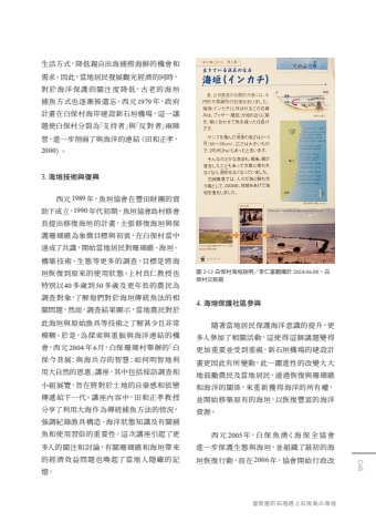 045%u7576%u65b0%u5c4b%u7684%u77f3%u586d%u9047%u4e0a%u77f3%u57a3%u5cf6%u306e%u6d77%u57a3%u751f%u6d3b%u65b9%u5f0f%uff0c%u964d%u4f4e%u89aa%u81ea%u51fa%u6d77%u6355%u6488%u6d77%u9bae%u7684%u6a5f%u6703%u548c%u9700%u6c42%u3002%u56e0%u6b64%uff0c%u7576%u5730%u5c45%u6c11%u767c%u5c55%u89c0%u5149%u7d93%u6fdf%u7684%u540c%u6642%uff0c%u5c0d%u65bc%u6d77%u6d0b%u4fdd%u8b77%u7684%u95dc%u6ce8%u5ea6%u964d%u4f4e%uff0c%u53e4%u8001%u7684%u6d77 %u57a3%u6355%u9b5a%u65b9%u5f0f%u4e5f%u9010%u6f38%u88ab%u907a%u5fd8%u3002%u897f%u51431979%u5e74%uff0c%u653f%u5e9c%u8a08%u756b%u5728%u767d%u4fdd%u6751%u6d77%u5cb8%u5efa%u8a2d%u65b0%u77f3%u57a3%u6a5f%u5834%uff0c%u9019%u4e00%u8b70%u984c%u4f7f%u767d%u4fdd%u6751%u5206%u88c2%u70ba%u300c%u652f%u6301%u8005%u300d%u8207%u300c%u53cd%u5c0d%u8005%u300d%u5169%u9663%u71df%uff0c%u9032%u4e00%u6b65%u524a%u5f31%u4e86%u8207%u6d77%u6d0b%u7684%u9023%u7d50%uff08%u7530%u548c%u6b63%u5b5d%uff0c2000%uff09%u30023.%u0009%u6d77%u57a3%u6280%u8853%u8207%u5fa9%u8208%u897f%u51431989%u5e74%uff0c%u9b5a%u57a3%u5354%u6703%u5728%u8c50%u7530%u8ca1%u5718%u7684%u8cc7%u52a9%u4e0b%u6210%u7acb%uff0c1990%u5e74%u4ee3%u521d%u671f%uff0c%u9b5a%u57a3%u5354%u6703%u5cf6%u6751%u4fee%u6703%u9577%u63d0%u51fa%u4fee%u5fa9%u6d77%u57a3%u7684%u8a08%u756b%uff0c%u4e3b%u5f35%u4fee%u5fa9%u6d77%u57a3%u8207%u4fdd%u8b77%u73ca%u745a%u7901%u70ba%u8c61%u5fb5%u76ee%u6a19%u8207%u521d%u8877%uff0c%u5728%u767d%u4fdd%u6751%u7576%u4e2d%u9054%u6210%u4e86%u5171%u8b58%uff0c%u958b%u59cb%u7576%u5730%u5c45%u6c11%u5c0d%u73ca%u745a%u7901%u3001%u6d77%u57a3%u3001%u69cb%u7bc9%u6280%u8853%u3001%u751f%u614b%u7b49%u66f4%u591a%u7684%u8abf%u67e5%uff0c%u76ee%u6a19%u662f%u5c07%u6d77%u57a3%u6062%u5fa9%u5230%u539f%u4f86%u7684%u4f7f%u7528%u72c0%u614b%u3002%u4e0a%u6751%u771f%u4ec1%u6559%u6388%u4e5f%u7279%u5225%u4ee540%u591a%u6b72%u523050%u591a%u6b72%u53ca%u66f4%u5e74%u9577%u7684%u8fb2%u6c11%u70ba%u8abf%u67e5%u5c0d%u8c61%uff0c%u4e86%u89e3%u4ed6%u5011%u5c0d%u65bc%u6d77%u57a3%u50b3%u7d71%u9b5a%u6cd5%u7684%u76f8%u95dc%u554f%u984c%uff0c%u7136%u800c%uff0c%u8abf%u67e5%u7d50%u679c%u986f%u793a%uff0c%u7576%u5730%u8fb2%u6c11%u5c0d%u65bc%u6b64%u6d77%u57a3%u8207%u539f%u59cb%u6f01%u5177%u7b49%u6280%u8853%u4e4b%u4e86%u89e3%u751a%u5c11%u4e14%u975e%u5e38%u6a21%u7cca%u3002%u65bc%u662f%uff0c%u70ba%u63a2%u7d22%u8207%u91cd%u632f%u8207%u6d77%u6d0b%u9023%u7d50%u7684%u6a5f%u6703%uff0c%u897f%u5143 2004%u5e746%u6708%uff0c%u767d%u4fdd%u73ca%u745a%u6751%u8209%u8fa6%u7684%u300c%u767d%u4fdd%u4eca%u6614%u5c55%uff1a%u8207%u6d77%u5171%u5b58%u7684%u667a%u6167%uff1a%u5982%u4f55%u660e%u667a%u5730%u5229%u7528%u5927%u81ea%u7136%u7684%u6069%u60e0%u300d%u8b1b%u5ea7%uff0c%u5176%u4e2d%u5305%u62ec%u63a1%u8a2a%u8abf%u67e5%u548c%u5c0f%u7d44%u5c55%u89bd%uff0c%u65e8%u5728%u5c07%u5c0d%u65bc%u571f%u5730%u7684%u81ea%u8c6a%u611f%u548c%u4f9d%u6200%u50b3%u905e%u7d66%u4e0b%u4e00%u4ee3%u3002%u8b1b%u5ea7%u5167%u5bb9%u4e2d%uff0c%u7530%u548c%u6b63%u5b5d%u6559%u6388%u5206%u4eab%u4e86%u5229%u7528%u5927%u6d77%u4f5c%u70ba%u50b3%u7d71%u6355%u9b5a%u65b9%u6cd5%u7684%u60c5%u6cc1%uff0c%u5f37%u8abf%u7d00%u9304%u6f01%u5177%u69cb%u9020%u3001%u6d77%u6d0b%u72c0%u614b%u77e5%u8b58%u53ca%u6709%u95dc%u6355%u9b5a%u548c%u4f7f%u7528%u7fd2%u4fd7%u7684%u91cd%u8981%u6027%u3002%u9019%u6b21%u8b1b%u5ea7%u5f15%u8d77%u4e86%u66f4%u591a%u4eba%u7684%u95dc%u6ce8%u548c%u8a0e%u8ad6%uff0c%u6709%u95dc%u73ca%u745a%u7901%u548c%u6d77%u57a3%u5e36%u4f86%u7684%u7d93%u6fdf%u6548%u76ca%u554f%u984c%u4e5f%u559a%u8d77%u4e86%u7576%u5730%u4eba%u96b1%u85cf%u7684%u8a18%u61b6%u3002%u5716 2-13 %u767d%u4fdd%u6751%u6d77%u57a3%u8aaa%u660e%uff0f%u674e%u4ec1%u5bcc%u7ffb%u651d%u65bc 2024.06.08%uff0c%u767d%u4fdd%u6751%u516c%u6c11%u99284.%u0009%u6d77%u57a3%u4fdd%u8b77%u793e%u5340%u53c3%u8207%u96a8%u8457%u7576%u5730%u5c45%u6c11%u4fdd%u8b77%u6d77%u6d0b%u610f%u8b58%u7684%u63d0%u5347%uff0c%u66f4%u591a%u4eba%u53c3%u52a0%u4e86%u76f8%u95dc%u6d3b%u52d5%uff0c%u9019%u4f7f%u5f97%u9019%u500b%u8b70%u984c%u8b8a%u5f97%u66f4%u52a0%u91cd%u8981%u4e26%u53d7%u5230%u91cd%u8996%uff0c%u65b0%u77f3%u57a3%u6a5f%u5834%u7684%u5efa%u8a2d%u8a08%u756b%u66f4%u56e0%u6b64%u6709%u6240%u8b8a%u52d5%uff0c%u6b64%u4e00%u8e8d%u9032%u6027%u7684%u6539%u8b8a%u5927%u5927%u5730%u9f13%u52f5%u8fb2%u6c11%u53ca%u7576%u5730%u5c45%u6c11%uff0c%u901a%u904e%u6062%u5fa9%u8207%u73ca%u745a%u7901%u548c%u6d77%u6d0b%u7684%u95dc%u4fc2%uff0c%u4f86%u91cd%u65b0%u7372%u5f97%u6d77%u6d0b%u7684%u6240%u6709%u6b0a%uff0c%u4e26%u958b%u59cb%u4fee%u7bc9%u539f%u6709%u7684%u6d77%u57a3%uff0c%u4ee5%u6062%u5fa9%u8c50%u5bcc%u7684%u6d77%u6d0b%u8cc7%u6e90%u3002%u897f %u5143 2005%u5e74%uff0c%u767d %u4fdd %u9b5a %u6e67%u304f%u6d77 %u4fdd %u5168 %u5354%u6703%u9032%u4e00%u6b65%u4fdd%u8b77%u751f%u614b%u8207%u6d77%u57a3%uff0c%u4e26%u7d44%u7e54%u4e86%u6700%u521d%u7684%u6d77%u57a3%u6062%u5fa9%u884c%u52d5%uff0c%u800c%u57282006%u5e74%uff0c%u5354%u6703%u958b%u59cb%u884c%u653f%u6539