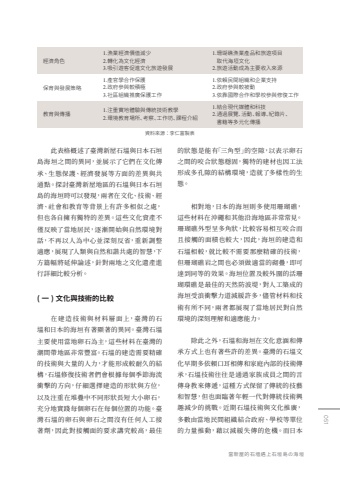 051%u7576%u65b0%u5c4b%u7684%u77f3%u586d%u9047%u4e0a%u77f3%u57a3%u5cf6%u306e%u6d77%u57a3%u8cc7%u6599%u4f86%u6e90%uff1a%u674e%u4ec1%u5bcc%u88fd%u8868%u5efa%u9020%u6280%u8853%u8207%u6750%u65991.%u4e3b%u8981%u4f7f%u7528%u7576%u5730%u9d5d%u5375%u77f32.%u9700%u7cbe%u78ba%u6280%u8853%u8207%u5927%u91cf%u4eba%u529b3.%u591a%u5b54%u9699%u7d50%u69cb%u4fc3%u9032%u591a%u6a23%u6027%u751f%u614b%u6bd4%u8f03%u9805%u76ee %u65b0%u5c4b%u77f3%u586d %u77f3%u57a3%u5cf6%u6d77%u57a31.%u4e3b%u8981%u4f7f%u7528%u73ca%u745a%u7901 2.%u6280%u8853%u76f8%u5c0d%u55ae%u7d14%u4f46%u9700%u9069%u7576%u780c%u758a3.%u73ca%u745a%u7901%u6709%u52a9%u6e1b%u7de9%u6d6a%u885d%u64ca%u6587%u5316%u610f%u6db5%u8207%u50b3%u627f%u65b9%u5f0f1.%u65e9%u671f%u4f9d%u8cf4%u53e3%u8033%u76f8%u50b32.%u5bb6%u65cf%u5167%u90e8%u6280%u8853%u50b3%u627f3.%u4eca%u7531%u6c11%u9593%u7d44%u7e54%u3001%u653f%u5e9c%u3001%u5b78%u6821%u63a8%u52d51.%u4f9d%u9760%u793e%u5340%u6d3b%u52d5%u548c%u6b63%u5f0f%u6559%u80b22.%u793e%u5340%u548c%u5b78%u6821%u901a%u904e%u6d3b%u52d5%u548c%u8ab2%u7a0b%u50b3%u64ad3.%u570b%u969b%u8207%u6c11%u9593%u7d44%u7e54%u8209%u8fa6%u6587%u5316%u6d3b%u52d5%u751f%u614b%u50f9%u503c1.%u591a%u5b54%u9699%u7d50%u69cb%u70ba%u6d77%u6d0b%u751f%u7269%u63d0%u4f9b%u68f2%u606f%u57302.%u7dad%u6301%u7576%u5730%u751f%u614b%u591a%u6a23%u6027%u548c%u5e73%u88611.%u73ca%u745a%u7901%u63d0%u4f9b%u7a69%u5b9a%u7684%u6d77%u6d0b%u751f%u7269%u68f2%u606f%u5730%u589e%u5f37%u751f%u7269%u591a%u6a23%u60272.%u751f%u614b%u4fdd%u8b77%u529f%u80fd%u76f8%u5c0d%u8f03%u4f4e%u7d93%u6fdf%u89d2%u82721.%u6f01%u696d%u7d93%u6fdf%u50f9%u503c%u6e1b%u5c11 2.%u8f49%u5316%u70ba%u6587%u5316%u7d93%u6fdf 3.%u5438%u5f15%u904a%u5ba2%u4fc3%u9032%u6587%u5316%u65c5%u904a%u767c%u5c551.%u73ca%u745a%u7901%u6f01%u696d%u7522%u54c1%u548c%u65c5%u904a%u9805%u76ee%u53d6%u4ee3%u6d77%u57a3%u6587%u53162.%u65c5%u904a%u6d3b%u52d5%u6210%u70ba%u4e3b%u8981%u6536%u5165%u4f86%u6e90%u4fdd%u80b2%u8207%u767c%u5c55%u7b56%u75651.%u7522%u5b98%u5b78%u5408%u4f5c%u4fdd%u8b77 2.%u653f%u5e9c%u53c3%u8207%u8f03%u7a4d%u69753.%u793e%u5340%u7d44%u7e54%u63a8%u5ee3%u4fdd%u8b77%u5de5%u4f5c1.%u4f9d%u8cf4%u6c11%u9593%u7d44%u7e54%u548c%u4f01%u696d%u652f%u63012.%u653f%u5e9c%u53c3%u8207%u8f03%u88ab%u52d53.%u4f9d%u9760%u570b%u969b%u5408%u4f5c%u548c%u5b78%u6821%u53c3%u8207%u4fee%u5fa9%u5de5%u4f5c%u6559%u80b2%u8207%u50b3%u64ad 1.%u6ce8%u91cd%u5be6%u5730%u9ad4%u9a57%u8207%u50b3%u7d71%u6280%u8853%u6559%u5b78 2.%u74b0%u5883%u6559%u80b2%u5834%u6240%u3001%u8003%u5bdf%u3001%u5de5%u4f5c%u574a%u3001%u8ab2%u7a0b%u4ecb%u7d391.%u7d50%u5408%u73fe%u4ee3%u5a92%u9ad4%u548c%u79d1%u6280 2.%u901a%u904e%u5c55%u89bd%u3001%u6d3b%u52d5%u3001%u5831%u5c0e%u3001%u7d00%u9304%u7247%u3001%u66f8%u7c4d%u7b49%u591a%u5143%u5316%u50b3%u64ad%u6b64%u8868%u683c%u6982%u8ff0%u4e86%u81fa%u7063%u65b0%u5c4b%u77f3%u586d%u8207%u65e5%u672c%u77f3%u57a3%u5cf6%u6d77%u57a3%u4e4b%u9593%u7684%u7570%u540c%uff0c%u4e26%u5c55%u793a%u4e86%u5b83%u5011%u5728%u6587%u5316%u50b3%u627f%u3001%u751f%u614b%u4fdd%u8b77%u3001%u7d93%u6fdf%u767c%u5c55%u7b49%u65b9%u9762%u7684%u5dee%u7570%u8207%u5171%u901a%u9ede%u3002%u63a2%u8a0e%u81fa%u7063%u65b0%u5c4b%u5730%u5340%u7684%u77f3%u586d%u8207%u65e5%u672c%u77f3%u57a3%u5cf6%u7684%u6d77%u57a3%u6642%u53ef%u4ee5%u767c%u73fe%uff0c%u5169%u8005%u5728%u6587%u5316%u3001%u6280%u8853%u3001%u7d93%u6fdf%u3001%u793e%u6703%u548c%u6559%u80b2%u7b49%u80cc%u666f%u4e0a%u6709%u8a31%u591a%u76f8%u4f3c%u4e4b%u8655%uff0c%u4f46%u4e5f%u5404%u81ea%u64c1%u6709%u7368%u7279%u7684%u5dee%u7570%u3002%u9019%u4e9b%u6587%u5316%u8cc7%u7522%u4e0d%u50c5%u53cd%u6620%u4e86%u7576%u5730%u5c45%u6c11%uff0c%u9010%u6f38%u958b%u59cb%u8207%u81ea%u7136%u74b0%u5883%u5c0d%u8a71%uff0c%u4e0d%u518d%u4ee5%u4eba%u70ba%u4e2d%u5fc3%u4e26%u6df1%u523b%u53cd%u7701%uff0c%u91cd%u65b0%u8abf%u6574%u9069%u61c9%uff0c%u5c55%u73fe%u4e86%u4eba%u985e%u8207%u81ea%u7136%u548c%u8ae7%u5171%u8655%u7684%u667a%u6167%uff0c%u4e0b%u65b9%u7bc7%u5e45%u5c07%u5ef6%u4f38%u8ad6%u8ff0%uff0c%u91dd%u5c0d%u5169%u5730%u4e4b%u6587%u5316%u907a%u7522%u9032%u884c%u8a73%u7d30%u6bd4%u8f03%u5206%u6790%u3002( %u4e00 ) %u6587%u5316%u8207%u6280%u8853%u7684%u6bd4%u8f03%u5728 %u5efa %u9020 %u6280%u8853%u8207 %u6750%u6599%u5c64%u9762%u4e0a%uff0c%u81fa%u7063%u7684%u77f3%u586d%u548c%u65e5%u672c%u7684%u6d77%u57a3%u6709%u8457%u986f%u8457%u7684%u7570%u540c%u3002%u81fa%u7063%u77f3%u586d%u4e3b%u8981%u4f7f%u7528%u7576%u5730%u5375%u77f3%u70ba%u4e3b%uff0c%u9019%u4e9b%u6750%u6599%u5728%u81fa%u7063%u7684%u6f6e%u9593%u5e36%u5730%u5340%u975e%u5e38%u8c50%u5bcc%u3002%u77f3%u586d%u7684%u5efa%u9020%u9700%u8981%u7cbe%u78ba%u7684%u6280%u8853%u8207%u5927%u91cf%u7684%u4eba%u529b%uff0c%u624d%u80fd%u5f62%u6210%u8f03%u8010%u4e45%u7684%u7d50%u69cb%uff0c%u77f3%u586d%u4fee%u5fa9%u6280%u8853%u8005%u5011%u6703%u6839%u64da%u6bcf%u500b%u5b63%u7bc0%u6d77%u6d41%u885d%u64ca%u7684%u65b9%u5411%uff0c%u4ed4%u7d30%u9078%u64c7%u5efa%u9020%u7684%u5f62%u72c0%u8207%u65b9%u4f4d%uff0c%u4ee5%u53ca%u6ce8%u91cd%u5728%u5806%u758a%u4e2d%u4e0d%u540c%u5f62%u72c0%u9577%u77ed%u5927%u5c0f%u5375%u77f3%uff0c%u5145%u5206%u5730%u5be6%u8e10%u6bcf%u500b%u5375%u77f3%u5728%u6bcf%u500b%u4f4d%u7f6e%u7684%u529f%u80fd%u3002%u81fa%u7063%u77f3%u586d%u7684%u5375%u77f3%u8207%u5375%u77f3%u4e4b%u9593%u6c92%u6709%u4efb%u4f55%u4eba%u5de5%u63a5%u8457%u5291%uff0c%u56e0%u6b64%u5c0d%u63a5%u89f8%u9762%u7684%u8981%u6c42%u8b1b%u7a76%u8f03%u9ad8%uff0c%u6700%u4f73%u7684%u72c0%u614b%u662f%u80fd%u6709%u300c%u4e09%u89d2%u578b%u300d%u7684%u7a7a%u9699%uff0c%u4ee5%u8868%u793a%u5375%u77f3%u4e4b%u9593%u7684%u54ac%u5408%u72c0%u614b%u7a69%u56fa%uff0c%u7368%u7279%u7684%u5efa%u6750%u4e5f%u56e0%u5de5%u6cd5%u5f62%u6210%u591a%u5b54%u9699%u7684%u7d50%u69cb%u74b0%u5883%uff0c%u9020%u5c31%u4e86%u591a%u6a23%u6027%u7684%u751f%u614b%u3002%u76f8%u5c0d%u5730%uff0c%u65e5%u672c%u7684%u6d77%u57a3%u5247%u591a%u4f7f%u7528%u73ca%u745a%u7901%uff0c%u9019%u4e9b%u6750%u6599%u5728%u6c96%u7e69%u548c%u5176%u4ed6%u6cbf%u6d77%u5730%u5340%u975e%u5e38%u5e38%u898b%u3002%u73ca%u745a%u7901%u5916%u578b%u5448%u591a%u89d2%u72c0%uff0c%u6bd4%u8f03%u5bb9%u6613%u76f8%u4e92%u54ac%u5408%u800c%u4e14%u63a5%u89f8%