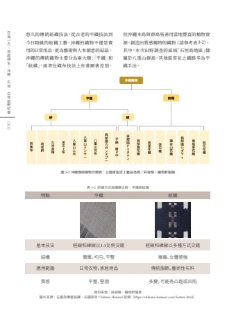 060%u5728%u6d77%u4e00%u65b9%u3001%u57a3%u8d77%u7de3%u751f%uff1a%u6c96%u7e69%u00b7%u77f3%u57a3%u00b7%u767d%u4fdd%u7530%u91ce%u7d00%u5be6%u60a0%u4e45%u7684%u50b3%u7d71%u7d21%u7e54%u6280%u6cd5%uff0c%u5f9e%u53e4%u8001%u7684%u5e73%u7e54%u6280%u6cd5%u5230%u4eca%u65e5%u7cbe%u7dfb%u7684%u7d0b%u7e54%u5de5%u85dd%uff0c%u6c96%u7e69%u7684%u7e54%u7269%u4e0d%u50c5%u662f%u5be6%u7528%u7684%u65e5%u5e38%u7528%u54c1%uff0c%u66f4%u70ba%u85dd%u8853%u8207%u4eba%u672c%u5275%u610f%u7684%u7d50%u6676%u3002%u6c96%u7e69%u7684%u50b3%u7d71%u7e54%u7269%u4e3b%u8981%u5206%u70ba%u5169%u5927%u985e%uff1a%u300c%u5e73%u7e54%u300d%u548c%u300c%u7d0b%u7e54%u300d%uff0c%u5169%u8005%u5728%u7e54%u5e03%u6280%u6cd5%u4e0a%u6709%u8457%u986f%u8457%u5dee%u5225%uff0c%u5716 3-2 %u6c96%u7e69%u50b3%u7d71%u7e54%u7269%u5206%u985e%u8868%uff1a%u4ee5%u570b%u5bb6%u6307%u5b9a%u5de5%u85dd%u54c1%u70ba%u4f8b%uff0f%u8a31%u5bb9%u6995%u3001%u937e%u4f91%u8ed2%u88fd%u5716%u8868 3-2 %u7d21%u7e54%u65b9%u5f0f%u8207%u7e54%u8def%u6bd4%u8f03%uff1a%u5e73%u7e54%u8207%u7d0b%u7e54%u8cc7%u6599%u4f86%u6e90%uff1a%u8a31%u5bb9%u6995%u3001%u937e%u4f91%u8ed2%u88fd%u8868%u5716%u7247%u4f86%u6e90%uff1a%u5de6%u5716%u70ba%u7b46%u8005%u62cd%u651d%u3001%u53f3%u5716%u4f86%u81ea Chibana Hanaori %u5b98%u7db2%uff08https://chibana-hanaori.com/feature.html%uff09%u7279%u9ede %u5e73%u7e54 %u7d0b%u7e54%u57fa%u672c%u6280%u6cd5%u7d50%u69cb%u7d93%u7dda%u548c%u7def%u7dda%u4ee51:1%u6bd4%u4f8b%u4ea4%u932f%u7c21%u55ae%u3001%u5747%u52fb%u3001%u5e73%u6574%u61c9%u7528%u7bc4%u570d%u8cea%u611f%u65e5%u5e38%u8863%u7269%u3001%u5bb6%u5c45%u7528%u54c1%u5e73%u6574%u3001%u5805%u56fa%u7d93%u7dda%u548c%u7def%u7dda%u4ee5%u591a%u7a2e%u65b9%u5f0f%u4ea4%u932f%u8907%u96dc%u3001%u7acb%u9ad4%u611f%u5f37%u50b3%u7d71%u670d%u98fe%u3001%u85dd%u8853%u6027%u5e03%u6599%u591a%u8b8a%uff0c%u53ef%u80fd%u6709%u51f8%u8d77%u6216%u51f9%u9677%u4f46%u6c96%u7e69%u672c%u5cf6%u8207%u7fa4%u5cf6%u7686%u5584%u7528%u7576%u5730%u8c50%u5bcc%u7684%u690d%u7269%u8cc7%u6e90%uff0c%u5275%u9020%u51fa%u8cea%u611f%u7368%u7279%u7684%u7e54%u7269%uff08%u8acb%u53c3%u8003%u88683-2%uff09%u3002%u5176%u4e2d%uff0c%u672c%u6b21%u7530%u91ce%u8abf%u67e5%u7684%u5340%u57df%u300c%u77f3%u57a3%u5cf6%u5730%u5340%u300d%u96b8%u5c6c%u65bc%u516b%u91cd%u5c71%u7fa4%u5cf6%uff0c%u5176%u5730%u5340%u5e38%u898b%u4e4b%u7e54%u8def%u591a%u70ba%u5e73%u7e54%u624b%u6cd5%u3002