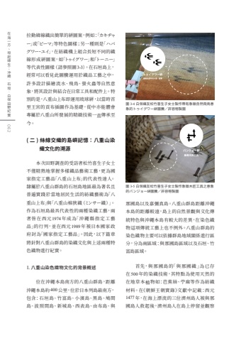 %u5716 3-4 %u767d%u4fdd%u7e54%u53cb%u677e%u7af9%u559c%u751f%u5b50%u5973%u58eb%u88fd%u4f5c%u5e36%u6709%u8c61%u5fb5%u81ea%u7136%u98db%u9ce5%u610f%u8c61%u7684%u30c8%u30a5%u30a4%u30b0%u30ef%u30fc%u7d63%u5716%u9a30%uff0f%u8a31%u5bb9%u6995%u88fd%u5716%u5716 3-5 %u767d%u4fdd%u7e54%u53cb%u677e%u7af9%u559c%u751f%u5b50%u5973%u58eb%u88fd%u4f5c%u8c61%u5fb5%u6728%u5320%u5de5%u5177%u4e4b%u610f%u8c61%u7684%u30d0%u30f3%u30b8%u30e7%u30fc%u7d63%u5716%u9a30%uff0f%u8a31%u5bb9%u6995%u88fd%u5716062%u5728%u6d77%u4e00%u65b9%u3001%u57a3%u8d77%u7de3%u751f%uff1a%u6c96%u7e69%u00b7%u77f3%u57a3%u00b7%u767d%u4fdd%u7530%u91ce%u7d00%u5be6%u62c9%u52d5%u7def%u7dda%u7e54%u51fa%u7c21%u55ae%u7684%u7d63%u5716%u6848%uff0c%u4f8b%u5982%uff1a%u300c%u30ab%u30ad%u30c2%u30e3%u30fc%u300d%u6216%u300c%u30d3%u30fc%u30de%u300d%u7b49%u7279%u8272%u5716%u6a23%uff1b%u53e6%u4e00%u7a2e%u5247%u662f%u300c%u30cf%u30d0%u30b0%u30ef%u30fc%u30fb%u30e6%u30a4%u300d%uff0c%u5728%u7d21%u7e54%u6a5f%u4e0a%u7d44%u5408%u9577%u77ed%u4e0d%u540c%u7684%u7e54%u7dda%u5f62%u6210%u7d63%u5716%u6848%uff0c%u5982%u300c%u30c8%u30a5%u30a4%u30b0%u30ef%u30fc%u300d%u548c%u300c%u30c8%u30fc%u30cb%u30fc%u300d%u7b49%u4ee3%u8868%u6027%u5716%u6a23%uff08%u8acb%u53c3%u7167%u57163-3%uff09%u3002%u5728%u77f3%u57a3%u5cf6%u4e0a%uff0c%u7d93%u5e38%u53ef%u4ee5%u770b%u898b%u6b64%u5716%u9a30%u904b%u7528%u65bc%u7e54%u54c1%u5de5%u85dd%u4e4b%u4e2d%uff0c%u8a31%u591a%u8a2d%u8a08%u63cf%u7e6a%u6d41%u6c34%u3001%u98db%u9ce5%u3001%u87a2%u706b%u87f2%u7b49%u81ea%u7136%u610f%u8c61%uff0c%u5c07%u5176%u8a2d%u8a08%u8207%u7d50%u5408%u5728%u65e5%u5e38%u5de5%u5177%u548c%u914d%u4ef6%u4e0a%u3002%u7279%u5225%u7684%u662f%uff0c%u516b%u91cd%u5c71%u4e0a%u5e03%u5373%u904b%u7528%u7409%u7403%u7d63%uff0c%u4ee5%u7576%u6642%u9996%u91cc%u738b%u5bae%u7684%u8ca2%u5e03%u63d2%u5716%u4f5c%u70ba%u57fa%u790e%uff0c%u5f9e%u4e2d%u4ea6%u80fd%u9ad4%u6703%u5c08%u5c6c%u65bc%u516b%u91cd%u5c71%u6240%u767c%u5c55%u7684%u7cbe%u7dfb%u6280%u8853%u4e00%u76f4%u50b3%u627f%u81f3%u4eca%u3002( %u4e8c ) %u7d72%u7dda%u4ea4%u7e54%u7684%u5cf6%u5dbc%u8a18%u61b6%uff1a%u516b%u91cd%u5c71%u67d3%u7e54%u6587%u5316%u7684%u6eaf%u6e90%u672c%u6b21%u7530%u91ce%u8abf%u67e5%u7684%u53d7%u8a2a%u8005%u677e%u7af9%u559c%u751f%u5b50%u5973%u58eb%u4e0d%u50c5%u7cbe%u719f%u5730%u638c%u63e1%u591a%u6a23%u7e54%u54c1%u85dd%u8853%u5de5%u85dd%uff0c%u66f4%u70ba%u570b%u5bb6%u6307%u5b9a%u5de5%u85dd%u54c1%u300c%u516b%u91cd%u5c71%u4e0a%u5e03%u300d%u7684%u4ee3%u8868%u6027%u9054%u4eba%u3002%u96b8%u5c6c%u65bc%u516b%u91cd%u5c71%u7fa4%u5cf6%u7684%u77f3%u57a3%u5cf6%u5730%u5340%u6700%u70ba%u8457%u540d%u4e14%u666e%u904d%u5be6%u8e10%u65bc%u7576%u5730%u5c45%u6c11%u751f%u6d3b%u7684%u7d21%u7e54%u85dd%u8853%u70ba%u300c%u516b%u91cd%u5c71%u4e0a%u5e03%u300d%u8207%u300c%u516b%u91cd%u5c71%u68c9%u72f9%u7e54%uff08%u30df%u30f3%u30b5%u30fc%u7e54%uff09%u300d%u3002%u4f5c%u70ba%u77f3%u57a3%u5cf6%u6700%u5177%u4ee3%u8868%u6027%u7684%u5169%u7a2e%u67d3%u7e54%u5de5%u85dd%uff0c%u5169%u8005%u7686%u5728%u897f%u51431974%u5e74%u6210%u70ba%u300c%u6c96%u7e69%u7e23%u6307%u5b9a%u5de5%u85dd%u54c1%u300d%u7684%u884c%u5217%uff0c%u4e26%u5728%u897f%u51431989%u5e74%u88ab%u65e5%u672c%u570b%u5bb6%u653f%u5e9c%u5c01%u70ba%u300c%u570b%u5bb6%u6307%u5b9a%u5de5%u85dd%u54c1%u300d%u3002%u56e0%u6b64%uff0c%u4ee5%u4e0b%u7bc7%u7ae0%u5c07%u91dd%u5c0d%u516b%u91cd%u5c71%u7fa4%u5cf6%u7684%u67d3%u7e54%u6587%u5316%u8207%u4e0a%u8ff0%u5169%u7a2e%u7279%u8272%u7e54%u7269%u9032%u884c%u7d00%u5be6%u30021. %u516b%u91cd%u5c71%u67d3%u8272%u7e54%u7269%u6587%u5316%u7684%u80cc%u666f%u6982%u8ff0%u4f4d%u5728%u6c96%u7e69%u672c%u5cf6%u5357%u65b9%u7684%u516b%u91cd%u5c71%u7fa4%u5cf6%uff0c%u8ddd%u96e2%u6c96%u7e69%u672c%u5cf6%u7d04400%u516c%u91cc%uff0c%u4f4d%u65bc%u65e5%u672c%u5217%u5cf6%u6700%u5357%u65b9%uff0c%u5305%u542b%uff1a%u77f3%u57a3%u5cf6%u3001%u7af9%u5bcc%u5cf6%u3001%u5c0f%u6ff1%u5cf6%u3001%u9ed1%u5cf6%u3001%u9ce9%u9593%u5cf6%u3001%u6ce2%u7167%u9593%u5cf6%u3001%u65b0%u57ce%u5cf6%u3001%u897f%u8868%u5cf6%u3001%u7531%u5e03%u5cf6%u3001%u8207%u90a3%u570b%u5cf6%u4ee5%u53ca%u5609%u5f4c%u771f%u5cf6%u3002%u516b%u91cd%u5c71%u7fa4%u5cf6%u8ddd%u96e2%u6c96%u7e69%u672c%u5cf6%u7684%u8ddd%u96e2%u8f03%u9060%uff0c%u5cf6%u4e0a%u7684%u81ea%u7136%u666f%u89c0%u8207%u6587%u5316%u50b3%u7d71%u7279%u8272%u8207%u6c96%u7e69%u672c%u5cf6%u6709%u8f03%u5927%u7684%u5dee%u7570%uff0c%u5728%u67d3%u8272%u7e54%u7269%u9019%u9805%u50b3%u7d71%u5de5%u85dd%u4e0a%u4e5f%u4e0d%u4f8b%u5916%u3002%u516b%u91cd%u5c71%u7fa4%u5cf6%u7684%u67d3%u8272%u7e54%u7269%u4e3b%u8981%u53ef%u4ee5%u4f9d%u64da%u7fa4%u5cf6%u5730%u57df%u95dc%u4fc2%u9032%u884c%u5340%u5206%uff0c%u5206%u70ba%u5169%u5340%u57df%uff1a%u8207%u90a3%u570b%u5cf6%u5340%u57df%u4ee5%u53ca%u77f3%u57a3%u3001%u7af9%u5bcc%u5cf6%u5340%u57df%u3002%u9996%u5148%uff0c%u8207 %u90a3%u570b%u5cf6%u7684%u300c %u8207 %u90a3%u570b %u7e54 %u300d%u70ba%u5df2%u5b58%u5728500%u5e74%u7684%u67d3%u7e54%u6280%u8853%uff0c%u5176%u7279%u9ede%u70ba%u4f7f%u7528%u5929%u7136%u7684%u5728%u5730%u8349%u672c%u690d%u7269%u5982%uff1a%u82ad%u8549%u7d72%u3001%u82e7%u9ebb%u7b49%u4f5c%u70ba%u7d21%u7e54%u6750%u6599%u3002%u5728%u300a%u671d%u9bae%u738b%u671d%u5be6%u9304%u300b%u6587%u737b%u4e2d%u8a18%u8f09%uff1a%u897f%u51431477%u5e74%uff0c%u5728%u6d77%u4e0a%u6f02%u6d41%u7684%u4e09%u4f4d%u6fdf%u5dde%u5cf6%u4eba%u88ab%u8207%u90a3%u570b%u5cf6%u4eba%u6551%u8d77%u5f8c%uff0c%u6fdf%u5dde%u5cf6%u4eba%u5728%u5cf6%u4e0a%u505c%u7559%u4e26%u89c0%u5bdf