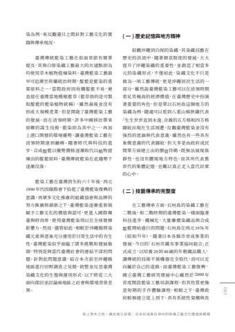 %u67d3%u70ba%u4f8b%uff0c%u4f86%u53cd%u89c0%u81fa%u65e5%u4e4b%u9593%u91dd%u5c0d%u5de5%u85dd%u6587%u5316%u7684%u5be6%u8e10%u8207%u50b3%u627f%u73fe%u6cc1%u3002%u81fa%u7063%u50b3%u7d71%u85cd%u67d3%u5de5%u85dd%u5728%u524d%u9762%u7ae0%u7bc0%u6709%u7c21%u55ae%u63d0%u53ca%uff0c%u5176%u8207%u767d%u4fdd%u67d3%u7e54%u5de5%u85dd%u6700%u5927%u7684%u5171%u901a%u9ede%u5373%u70ba%u5747%u4f7f%u7528%u8349%u6728%u690d%u7269%u63d0%u7149%u67d3%u6599%u3002%u81fa%u7063%u85cd%u67d3%u5de5%u85dd%u6700%u65e9%u53ef%u8ffd%u6eaf%u81f3%u8377%u862d%u7d71%u6cbb%u6642%u671f%uff0c%u975b%u85cd%u662f%u85cd%u67d3%u7684%u91cd%u8981%u539f%u6599%u4e4b%u4e00%uff0c%u7576%u969b%u653f%u5e9c%u56e0%u6536%u8cfc%u975b%u85cd%u4e0d%u6613%uff0c%u4fbf%u76f4%u63a5%u5728%u81fa%u7063%u7576%u5730%u7a2e%u690d%u85cd%u8349%uff08%u85cd%u8349%u6307%u7684%u662f%u53ef%u88fd%u53d6%u975b%u85cd%u7684%u85cd%u67d3%u690d%u7269%u7d71%u7a31%uff09%uff0c%u96d6%u7136%u6700%u5f8c%u4e26%u6c92%u6709%u5f62%u6210%u5927%u898f%u6a21%u7522%u696d%uff0c%u4f46%u662f%u958b%u555f%u4e86%u81fa%u7063%u85cd%u67d3%u5de5%u85dd%u7684%u767c%u5c55%u3002%u800c%u5728%u6e05%u9818%u6642%u671f%uff0c%u8a31%u591a%u4e2d%u570b%u79fb%u6c11%u5e36%u4f86%u539f%u9109%u7684%u8b00%u751f%u6280%u8853%uff0c%u85cd%u67d3%u5373%u70ba%u5176%u4e2d%u4e4b%u4e00%uff0c%u518d%u52a0%u4e0a%u6e2f%u53e3%u958b%u767c%u7684%u74b0%u5883%u512a%u52e2%uff0c%u8b93%u81fa%u7063%u85cd%u67d3%u5de5%u85dd%u5728%u6e05%u9818%u6642%u671f%u9054%u5230%u5dd4%u5cf0%u3002%u96a8%u8457%u6642%u4ee3%u8207%u79d1%u6280%u7684%u9032%u6b65%uff0c%u5408%u6210%u975b%u85cd%u4ee5%u512a%u52e2%u50f9%u683c%u9010%u6f38%u53d6%u4ee3%u4ee5%u690d%u7269%u63d0%u7149%u51fa%u7684%u975b%u85cd%u539f%u6599%uff0c%u81fa%u7063%u50b3%u7d71%u85cd%u67d3%u5728%u6b64%u8da8%u52e2%u4e0b%u9010%u6f38%u6c92%u843d%u3002%u85cd%u67d3%u5de5%u85dd%u5728%u81fa%u7063%u6d88%u5931%u7d04%u516d%u5341%u5e74%u5f8c%uff0c%u897f%u51431990%u5e74%u4ee3%u56e0%u7de3%u969b%u6703%u4e0b%u62fe%u8d77%u4e86%u81fa%u7063%u85cd%u67d3%u5fa9%u8208%u7684%u610f%u8b58%uff0c%u518d%u773e%u591a%u6587%u5316%u63a8%u5ee3%u7684%u7d44%u7e54%u5354%u6703%u8207%u54c1%u724c%u7684%u52aa%u529b%u63a8%u5ee3%u8207%u5275%u65b0%u4e4b%u4e0b%uff0c%u81fa%u7063%u85cd%u67d3%u9010%u6f38%u91cd%u65b0%u88ab%u8ce6%u4e88%u5de5%u85dd%u6587%u5316%u7684%u50f9%u503c%u8207%u8a8d%u53ef%uff0c%u66f4%u9032%u5165%u570b%u969b%u821e%u81fa%u8207%u6642%u5c1a%u754c%uff0c%u4f7f%u5f97%u81fa%u7063%u85cd%u67d3%u5f97%u4ee5%u5728%u5168%u7403%u767c%u63ee%u5f71%u97ff%u529b%u3002%u7136%u800c%uff0c%u5118%u7ba1%u5982%u6b64%uff0c%u76f8%u8f03%u65bc%u6c96%u7e69%u7e23%u5c07%u67d3%u7e54%u5143%u7d20%u8207%u610f%u8c61%u5145%u5206%u904b%u7528%u65bc%u65e5%u5e38%u751f%u6d3b%u4e2d%u7684%u6709%u751f%u6027%uff0c%u81fa%u7063%u85cd%u67d3%u4f3c%u4e4e%u9762%u81e8%u4e86%u8af8%u591a%u6311%u6230%u548c%u767c%u5c55%u74f6%u9838%uff0c%u7279%u5225%u662f%u8207%u7576%u4ee3%u81fa%u7063%u793e%u6703%u7684%u9023%u7d50%u4e0d%u6df1%u7684%u554f%u984c%u3002%u91dd%u5c0d%u6b64%u554f%u984c%u610f%u8b58%uff0c%u7d50%u5408%u672c%u6b21%u524d%u81f3%u6c96%u7e69%u7e23%u5730%u5340%u9032%u884c%u7530%u91ce%u8abf%u67e5%u4e4b%u898b%u805e%uff0c%u7d71%u6574%u4e26%u53cd%u601d%u81fa%u7063%u67d3%u7e54%u6587%u5316%u7684%u751f%u614b%u8207%u904b%u7528%u5f62%u5f0f%uff0c%u4ee5%u4e0b%u5c07%u5f9e%u4e09%u5927%u9762%u5411%u63a2%u8a0e%u4e26%u8a0e%u8ad6%u5169%u5730%u5340%u4e4b%u793e%u6703%u8207%u74b0%u5883%u80cc%u666f%u5dee%u7570%u3002( %u4e00 ) %u6b77%u53f2%u8a18%u61b6%u8207%u5730%u65b9%u7cbe%u795e%u7d9c%u89c0%u6c96%u7e69%u5230%u767d%u4fdd%u7684%u67d3%u7e54%uff0c%u5176%u67d3%u7e54%u6280%u85dd%u5728%u6b77%u53f2%u7684%u6d2a%u6d41%u4e2d%uff0c%u96a8%u8457%u671d%u8ca2%u5236%u5ea6%u7684%u767c%u5c55%uff0c%u5927%u5927%u63d0%u5347%u4e86%u6c96%u7e69%u67d3%u7e54%u7684%u91cd%u8981%u6027%uff0c%u4e26%u5275%u9020%u4e86%u76f8%u7576%u591a%u5143%u7684%u67d3%u7e54%u5f62%u5f0f%uff0c%u4e0d%u50c5%u5982%u6b64%uff0c%u67d3%u7e54%u6587%u5316%u4e0d%u53ea%u662f%u505a%u70ba%u4e00%u9805%u5de5%u85dd%u50b3%u7d71%uff0c%u66f4%u662f%u6c96%u7e69%u5c45%u6c11%u751f%u6d3b%u7684%u4e00%u90e8%u5206%uff0c%u96d6%u7136%u8aaa%u81fa%u7063%u85cd%u67d3%u5de5%u85dd%u53ef%u4ee5%u5728%u6e05%u9818%u6642%u671f%u770b%u898b%u5176%u6975%u9ad8%u7684%u7d93%u6fdf%u50f9%u503c%uff0c%u5728%u81fa%u7063%u6b77%u53f2%u4e2d%u626e%u6f14%u8457%u91cd%u8981%u7684%u89d2%u8272%uff0c%u4f46%u662f%u55ae%u4ee5%u77f3%u57a3%u5cf6%u9019%u500b%u5730%u65b9%u7684%u67d3%u7e54%u70ba%u4f8b%uff0c%u96a8%u8655%u53ef%u4ee5%u770b%u5230%u516b%u91cd%u5c71%u68c9%u72f9%u7e54%u4ee3%u8868%u300c%u751f%u751f%u4e16%u4e16%u76f4%u5230%u6c38%u9060%u300d%u542b%u7fa9%u7684%u4e94%u65b9%u683c%u548c%u56db%u65b9%u683c%u5716%u7d0b%u51fa%u73fe%u5728%u751f%u6d3b%u5468%u906d%u3002%u53cd%u89c0%u81fa%u7063%u85cd%u67d3%u4e26%u6c92%u6709%u5f37%u70c8%u7684%u610f%u6db5%u8207%u4ee3%u8868%u610f%u7fa9%uff0c%u96d6%u7136%u4e5f%u6709%u4e00%u4e9b%u5177%u6709%u8c61%u5fb5%u610f%u7fa9%u7684%u4ee3%u8868%u5716%u7d0b%uff0c%u4f46%u5927%u591a%u662f%u7531%u653f%u5e9c%u6216%u6c11%u9593%u55ae%u65b9%u9762%u5efa%u7acb%u51fa%u7684%u50f9%u503c%u7b26%u78bc%uff0c%u65e2%u7121%u6cd5%u5c55%u73fe%u65cf%u7fa4%u6027%uff0c%u4e5f%u6c92%u6709%u9ad4%u73fe%u5730%u65b9%u7279%u8272%uff0c%u800c%u5176%u6240%u4ee3%u8868%u820a%u4e16%u4ee3%u7684%u96c6%u9ad4%u8a18%u61b6%uff0c%u4e5f%u96e3%u4ee5%u771f%u6b63%u8d70%u5165%u7576%u4ee3%u6c11%u773e%u7684%u5fc3%u4e2d%u3002%u5728%u5de5%u85dd%u50b3%u627f%u65b9%u9762%uff0c%u77f3%u57a3%u5cf6%u7684%u67d3%u7e54%u5de5%u85dd%u5728%u4e8c%u6230%u5f8c%uff0c%u548c%u4e8c%u6230%u6642%u671f%u7684%u81fa%u7063%u85cd%u67d3%u4e00%u6a23%u9762%u81e8%u8457%u79d1%u6280%u9032%u6b65%u3001%u6a5f%u68b0%u5316%uff0c%u5927%u91cf%u5ec9%u50f9%u67d3%u7e54%u54c1%u8207%u5408%u6210%u975b%u85cd%u958b%u59cb%u76db%u884c%u7684%u554f%u984c%uff0c%u77f3%u57a3%u5cf6%u5728%u897f%u51431976%u5e74%uff08%u662d%u548c51%u5e74%uff09%uff0c%u96a8%u8457%u65e5%u672c%u5404%u7e23%u5e02%u80b2%u6210%u4e8b%u696d%u7684%u767c%u5c55%uff0c%u4eca%u65e5%u7684%u300c%u77f3%u57a3%u5e02%u7e54%u5e03%u4e8b%u696d%u5354%u540c%u7d44%u5408%u300d%u6b63%u5f0f%u6210%u7acb%uff0c%u4ee5%u57f9%u990a20%u523040%u6b72%u7684%u5e74%u8f1