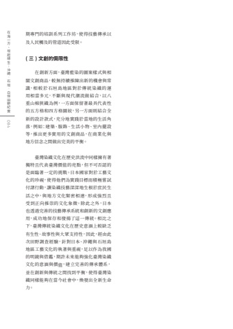 %u671f%u5c08%u9580%u7684%u57f9%u8a13%u7cfb%u5217%u5de5%u4f5c%u574a%uff0c%u4f7f%u5f97%u6280%u85dd%u50b3%u627f%u4ee5%u53ca%u4eba%u6c11%u89f8%u53ca%u7684%u7ba1%u9053%u56e0%u6b64%u53d7%u9650%u3002( %u4e09 ) %u6587%u5275%u7684%u4fb7%u9650%u6027%u5728%u5275%u65b0%u65b9%u9762%uff0c%u81fa%u7063%u85cd%u67d3%u7684%u5716%u6848%u6a23%u5f0f%u8207%u76f8%u95dc%u6587%u5275%u5546%u54c1%uff0c%u8f03%u7121%u6301%u7e8c%u63a8%u9673%u51fa%u65b0%u7684%u6a5f%u6703%u8207%u5e38%u8b58%uff0c%u76f8%u8f03%u65bc%u77f3%u57a3%u5cf6%u5730%u5340%u5c0d%u65bc%u50b3%u7d71 %u67d3 %u7e54%u7684%u904b%u7528%u76f8%u7576%u591a%u5143%uff0c%u4e0d%u65b7%u8207%u73fe%u4ee3%u6f6e%u6d41%u505a%u7d50%u5408%uff0c%u4ee5%u516b%u91cd%u5c71%u68c9%u72f9%u7e54%u70ba%u4f8b%uff0c%u4e00%u65b9%u9762%u4fdd%u7559%u8457%u6700%u5177%u4ee3%u8868%u6027%u7684%u4e94%u65b9%u683c%u548c%u56db%u65b9%u683c%u5716%u7d0b%uff0c%u53e6%u4e00%u65b9%u9762%u5247%u7d50%u5408%u5168%u65b0%u7684%u8a2d%u8a08%u6b3e%u5f0f%uff0c%u5145%u5206%u5730%u5be6%u8e10%u65bc%u7576%u5730%u7684%u751f%u6d3b%u89d2%u843d%uff0c%u4f8b%u5982%uff1a%u5efa%u7bc9%u3001%u670d%u98fe%u3001%u751f%u6d3b%u5c0f%u7269%u3001%u5ba4%u5167%u64fa%u8a2d%u7b49%uff0c%u63a8%u51fa%u66f4%u591a%u5be6%u7528%u7684%u6587%u5275%u5546%u54c1%uff0c%u5728%u5546%u696d%u5316%u8207%u5730%u65b9%u4fe1%u5ff5%u4e4b%u9593%u505a%u51fa%u5b8c%u7f8e%u7684%u5e73%u8861%u3002%u81fa%u7063%u67d3%u7e54%u6587%u5316%u5728%u6b77%u53f2%u6d2a%u6d41%u4e2d%u540c%u6a23%u64c1%u6709%u8457%u7368%u7279%u4e14%u4ee3%u8868%u81fa%u7063%u50f9%u503c%u7684%u4eae%u9ede%uff0c%u4f46%u4e0d%u53ef%u5426%u8a8d%u7684%u662f%u9762%u81e8%u8457%u4e00%u5b9a%u7684%u6311%u6230%u3002%u65e5%u672c%u570b%u5bb6%u5c0d%u65bc%u5de5%u85dd%u6587%u5316%u7684%u73cd%u8996%uff0c%u4f7f%u5f97%u4ed6%u5011%u70ba%u5be6%u8e10%u76ee%u6a19%u800c%u7a4d%u6975%u5617%u8a66%u4ed8%u8af8%u884c%u52d5%uff0c%u8b93%u67d3%u7e54%u6280%u85dd%u6df1%u6df1%u5730%u751f%u6839%u65bc%u5eb6%u6c11%u751f%u6d3b%u4e4b%u4e2d%uff0c%u8207%u5730%u65b9%u6587%u5316%u7dca%u5bc6%u76f8%u9023%uff0c%u5f62%u6210%u5f37%u70c8%u4e14%u53d7%u5230%u6b63%u5411%u63a8%u5d07%u7684%u6587%u5316%u8c61%u5fb5%u3002%u9664%u6b64%u4e4b%u5916%uff0c%u65e5%u672c%u4e5f%u900f%u904e%u5b8c%u5584%u7684%u6280%u85dd%u50b3%u627f%u7cfb%u7d71%u548c%u5275%u65b0%u7684%u6587%u5275%u61c9%u7528%uff0c%u6210%u529f%u5730%u4fdd%u5b58%u548c%u767c%u63da%u4e86%u9019%u4e00%u50b3%u7d71%u3002%u76f8%u6bd4%u4e4b%u4e0b%uff0c%u81fa%u7063%u50b3%u7d71%u67d3%u7e54%u6587%u5316%u5728%u6b77%u53f2%u610f%u6db5%u4e0a%u8f03%u7f3a%u4e4f%u6709%u751f%u6027%u3001%u6545%u4e8b%u6027%u8207%u5927%u773e%u652f%u6301%u6027%uff0c%u56e0%u6b64%uff0c%u7d93%u7531%u6b64%u6b21%u7530%u91ce%u8abf%u67e5%u7d93%u9a57%uff0c%u91dd%u5c0d%u65e5%u672c%u3001%u6c96%u7e69%u8207%u77f3%u57a3%u5cf6%u5730%u5340%u5de5%u85dd%u6587%u5316%u7684%u57f7%u8457%u8207%u91cd%u8996%uff0c%u8db3%u4ee5%u4f5c%u70ba%u6211%u570b%u7684%u660e%u93e1%u8207%u501f%u9451%uff0c%u671f%u8a31%u672a%u4f86%u80fd%u5920%u5f37%u5316%u81fa%u7063%u67d3%u7e54%u6587%u5316%u7684%u610f%u6db5%u8207%u50f9%u503c%uff0c%u5efa%u7acb%u5b8c%u5584%u7684%u50b3%u627f%u9ad4%u7cfb%uff0c%u4e26%u5728%u5275%u65b0%u8207%u50b3%u7d71%u4e4b%u9593%u627e%u5230%u5e73%u8861%uff0c%u4f7f%u5f97%u81fa%u7063%u67d3%u7e54%u540c%u6a23%u80fd%u5920%u5728%u7576%u4eca%u793e%u6703%u4e2d%uff0c%u7165%u767c%u51fa%u5168%u65b0%u751f%u547d%u529b%u3002084%u5728%u6d77%u4e00%u65b9%u3001%u57a3%u8d77%u7de3%u751f%uff1a%u6c96%u7e69%u00b7%u77f3%u57a3%u00b7%u767d%u4fdd%u7530%u91ce%u7d00%u5be6