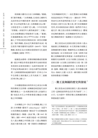 %u300c%u6c11%u4fd7%u821e%u8e0a%u7814%u7a76%u6240%u300d1%u3002%uff0c%u800c%u5728%u6574%u500b%u65e5%u672c%u7684%u821e%u8e0a%u7528%u6d41%u6d3e%u5247%u662f%u6709120%u7a2e%u5de6%u53f3%u3002%uff08%u85e4%u7530%u6d0b%uff0c2010%uff09%u7136%u800c%u53ef%u4ee5%u518d%u591a%u8aaa%u660e%u7684%u5730%u65b9%u5728%u65bc%uff0c%u516b%u91cd%u5c71%u821e%u8e48%u7684%u6d41%u6d3e%u4e3b%u8981%u53ef%u5206%u70ba%u300c%u52e4%u738b%u6d41%u300d%u8207%u300c%u6c11%u4fd7%u821e%u8e0a%u7814%u7a76%u6240%u300d%u7684%u5404%u500b%u6703%u6d3e%u5169%u5927%u985e%u5225%u3002%u4ed6%u5011%u7684%u4e0d%u540c%u4e4b%u8655%u5728%u65bc%uff1a%u52e4%u738b%u6d41%u4ee5%u7409%u7403%u53e4%u5178%u821e%u8e48%u70ba%u4e3b%uff0c%u9ad4%u73fe%u5bae%u5ef7%u821e%u7684%u85dd%u8853%u6027%uff1b%u6c11%u4fd7%u821e%u8e0a%u7814%u7a76%u6240%u4e3b%u8981%u95dc%u6ce8%u5730%u65b9%u821e%u8e48%u7684%u4fdd%u5b58%uff0c%u5f37%u8abf%u5730%u65b9%u6587%u5316%u7684%u6d3b%u529b%u3002%u52e4%u738b%u6d41%u662f%u7531%u6bd4%u5c4b%u6839%u5b89%u5f3c%u5728%u7409%u7403%u516b%u91cd%u5c71%u5730%u5340%u5275%u7acb%u7684%u821e%u8e0a%u6d41%u6d3e%uff0c%u672c%u6587%u5c07%u8a73%u7d30%u4ecb%u7d39%u52e4%u738b%u6d41%u821e%u8e0a%u7684%u6b77%u53f2%u767c%u5c55%u3001%u821e%u8e0a%u7279%u8272%u4ee5%u53ca%u821e%u8e0a%u5728%u7576%u5730%u7684%u5c55%u73fe%u3002%u672c%u6587%u7ae0%u7bc0%u5b89%u6392%uff0c%u5728%u7b2c%u4e8c%u7bc0%u5c07%u4ecb%u7d39%u52e4%u738b%u6d41%u821e%u8e0a%u7684%u6b77%u53f2%u8207%u767c%u5c55%uff0c%u5167%u5bb9%u5c07%u8aaa%u660e%u672c%u6587%u76f8%u95dc%u7684%u540d%u8a5e%u89e3%u91cb%uff0c%u4ee5%u53ca%u4ecb%u7d39%u52e4%u738b%u6d41%u59cb%u7956%uff1a%u6bd4%u5c4b%u6839%u5b89%u5f3c%uff0c%u4ee5%u53ca%u52e4%u738b%u6d41%u7684%u6b77%u53f2%u5206%u6d41%u3002%u7b2c%u4e09%u7bc0%u5247%u662f%u8aaa%u660e%u52e4%u738b%u6d41%u821e%u8e0a%u7684%u7279%u8272%uff0c%u5c24%u5176%u8457%u91cd%u5728%u624b%u90e8%u3001%u670d%u98fe%u3001%u821e%u8e0a%u4e3b%u984c%u4e09%u5927%u9762%u5411%uff0c%u5176%u4e2d%u821e%u8e0a%u4e3b%u984c%u6709%u5c71%u3001%u6d77%u5169%u5927%u4e3b%u984c%uff0c%u4ee5%u53ca%u53e6%u4e00%u9f63%u6709%u95dc%u65e5%u672c%u6c11%u9593%u6545%u4e8b%u5ea7%u6577%u7ae5%u5b50%u7684%u821e%u8e0a%u3002%u52e4%u738b%u6d41%u662f%u7531%u6bd4%u5c4b%u6839%u5b89%u5f3c%u5728%u516b%u91cd%u5c71%u5730%u5340%u5275%u7acb%u7684%uff0c%u9019%u500b%u6d41%u6d3e%u7684%u7279%u8272%u5728%u65bc%u5176%u624b%u632f%u578b%u300c%u4e8c%u5341%u4e8c%u306e%u624b%u300d%u3002%u5728%u672c%u7bc0%u4e2d%uff0c%u5c07%u5c0d%u65bc%u52e4%u738b%u6d41%u821e%u8e0a%u7684%u6b77%u53f2%u8207%u767c%u5c55%u9032%u884c%u8aaa%u660e%u3002%u7409%u7403%u8e0a%u5927%u6982%u53ef%u4ee5%u5206%u70ba%u300c%u53e4%u5178%u821e%u8e0a%u300d%u3001%u300c%u96dc%u8e0a%u300d%u548c%u300c%u5275%u4f5c%u821e%u8e0a%u300d%u3002%u300c%u53e4%u5178%u821e%u8e0a%u300d%u5728%u7409%u7403%u738b%u570b%u6642%u4ee3%u70ba%u62db%u5f85%u4f86%u81ea%u4e2d%u570b%u7684%u4f7f%u8005%uff08%u518a%u5c01%u4f7f%uff09%u800c%u8868%u6f14%u821e%u8e48%uff0c%u81f318%u4e16%u7d00%u6642%u96c6%u5927%u6210%u3002%u53e4%u5178%u821e%u8e0a%u5206%u70ba4%u985e%uff0c%u5206%u5225%u662f%u8001%u5e74%u4eba%u592b%u59bb%u7684%u300c%u8001%u4eba%u8e0a%u300d%uff0c%u5c11%u5e74%u6253%u626e%u7684%u300c%u82e5%u773e%u8e0a%u300d%uff0c%u8868%u73fe%u9752%u5e74%u4eba%u51dc%u7136%u98a8%u59ff%u7684%u300c%u4e8c%u624d%u8e0a%u300d%uff0c%u4ee5%u53ca%u8eab%u62ab%u8277%u9e97%u7d05%u578b%u670d%u98fe%u7684%u300c%u5973%u8e0a%u300d%u3002%u300c%u96dc %u8e0a%u300d%u5728%u5ee2%u85e9%u7f6e%u7e23%u5f8c%uff08%u897f%u51431879%u5e74%u4ee5%u5f8c%uff09%u624d%u767b%u5834%uff0c%u878d%u5165%u4e86%u5e73%u660e%u767e%u59d3%u7684%u97f3%u6a02%u548c%u6c11%u4fd7%uff0c%u6df1%u53d7%u6c11%u773e%u6b61%u8fce%u3002%u300c%u5275%u4f5c%u821e%u8e0a%u300d%u662f%u7531%u8fd1%u4ee3%u821e%u8005%u5275%u4f5c%u800c%u6210%uff0c%u73fe%u5728%u4f9d%u7136%u4e0d%u65b7%u6709%u512a%u79c0%u4f5c%u54c1%u554f%u4e16%u30022009%u5e74%uff0c%u300c%u7409%u7403%u821e%u8e0a%u300d%u88ab%u6307%u5b9a%u70ba%u65e5%u672c%u570b%u5bb6%u91cd%u8981%u7121%u5f62%u6587%u5316%u907a%u7522%uff08%u6c96%u7e69%u570b%u7acb%u5287%u5834%uff0c2024%uff09%u3002%u7d44%u8e0a%u662f%u7531%u6b4c%u5531%u3001%u97f3%u6a02%u548c%u821e%u8e48%u69cb%u6210%u7684%u6b4c%u821e%u5287%u3002%u904e%u53bb%u4e2d%u570b%u7687%u5e1d%u666e%u6d3e%u9063%u4f7f%u8005%u4f5c%u70ba%u518a%u5c01%u4f7f%u524d%u4f86%u7409%u7403%u4efb%u547d%u65b0%u7409%u7403%u570b%u738b%uff0c%u70ba%u63a5%u5f85%u518a%u5c01%u4f7f%uff0c%u65bc18%u4e16%u7d00%u521d%u671f%u7531%u8e48%u5949%u884c%uff08%u5bae%u5ef7%u5167%u5c08%u9580%u8ca0%u8cac%u6b4c%u821e%u8005%uff09%u7389%u57ce%u671d%u85b0%u958b%u59cb%u7d44%u8e0a%u7684%u5275%u4f5c%uff0c%u65bc%u897f%u51431719%u5e74%u5728%u5c1a%u656c%u738b%u518a%u5c01%u5100%u5f0f%u4e0a%u9996%u6b21%u8868%u6f14%u4e86%u300a%u4e8c%u7ae5%u6575%u8a0e%u300b%u548c%u300a%u57f7%u5fc3%u9418%u5165%u300b%u3002%u65e5%u672c%u85dd%u80fd%u767c%u5c55%u51fa%u4f86%u7684%u5f62%u5f0f%u5df2%u6210%u70ba%u65e5%u672c%u7368%u7279%u7684%u50b3%u7d71%u6587%u5316%u7279%u5fb5%uff0c%u800c%u821e%u8e0a%u662f%u76f8%u7576%u80fd%u4ee3%u8868%u6c96%u7e69%u7684%u85dd%u80fd%u4e4b%u4e00%uff0c%u70ba%u672c%u8abf%u67e5%u5831%u544a%u6df1%u5165%u8a0e%u8ad6%u7684%u4e3b%u984c%uff0c%u56e0%u6b64%u5728%u672c%u6587%u4e4b%u4e2d%u5c07%u6703%u8457%u91cd%u5728%u95e1%u8ff0%u65e5%u672c%u85dd%u80fd%u4e4b%u4e2d%u7684%u821e%u8e0a%u3002%u65e5%u672c%u821e%u8e48%u4e4b%u4e2d%uff0c%u591a%u4ee5%u300c%u65e5%u672c%u821e%u8e0a%u300d%u7a31%u4e4b%uff08%u65e5%u8a9e%uff1a%u65e5%u672c%u821e%u8e0a%uff0c%u7f85%u99ac%u5b57%uff1anihon buyou%uff09%uff0c%u70ba%u7576%u4eca%u65e5%u672c%u7684%u50b3%u7d71%u8868%u6f14%u85dd%u8853%uff0c%u985e%u4f3c%u65bc%u4eca%u5929%u7684%u821e%u8e48%u8207%u555e%u5287%u7684%u878d%u5408%u3002%u821e%u8e0a%u4e00%u8a5e%u7531%u300c%u821e%u300d%uff08%u821e%uff0cmai%uff09%u548c%u300c%u8e0a%u308a%u300d%uff08%u8e0a%u308a%uff0codori%uff09%u5169%u90e8%u5206%u7d44%u6210%u3002%u672c%u6587%u5c07%u8457%u91cd%u5728%u516b%u91cd%u5c71%u821e%u8e0a%u4e4b%u4e2d%u7684%u52e4%u738b%u6d41%uff0c%u516b%u91cd%u5c71%u821e%u8e0a%u7684%u6d41%u6d3e%u53ea%u50c5%u6709%u52e4%u738b%u6d41%u4e00%u7a2e%uff0c%u5176%u9918%u7684%u5206%u985e%u9ad4%u73fe%u65bc%u4e8c%u3001%u52e4%u738