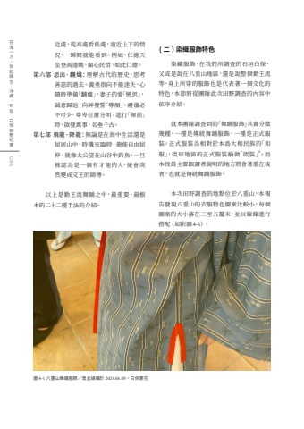 %u8fd1%u8655%uff0c%u5f9e%u9ad8%u8655%u770b%u4f4e%u8655%uff0c%u9060%u8fd1%u4e0a%u4e0b%u7684%u60c5%u6cc1%uff0c%u4e00%u77ac%u9593%u5c31%u80fd%u770b%u5230%u3002%u4f8b%u5982%uff0c%u4ec1%u5fb7%u5929%u7687%u767b%u9ad8%u9060%u773a%uff0c%u95dc%u5fc3%u6c11%u60c5%uff0c%u5982%u6b64%u4ec1%u5fb7%u3002%u7b2c%u516d%u90e8 %u601d%u51fa%u3001%u98dc%u71be%uff1a%u7406%u89e3%u53e4%u4ee3%u7684%u6b77%u53f2%uff0c%u601d%u8003%u5584%u60e1%u7684%u904e%u53bb%u3002%u7fa9%u52c7%u6307%u5411%u4e0d%u80fd%u8ff7%u5931%uff0c%u5fc3%u96a8%u6642%u6e96%u5099%u300c%u98dc%u71be%u300d%uff0c%u59bb%u5b50%u7684%u611b%u300c%u6200%u601d%u300d%uff0c%u8aa0%u610f%u6b78%u8fd4%uff0c%u5411%u795e%u767c%u8a93%u300c%u5c0a%u9854%u300d%u3002%u79ae%u5100%u5fc5%u4e0d%u53ef%u5c11%uff0c%u5c0a%u5351%u4f4d%u7f6e%u5206%u660e%u3002%u9032%u884c%u300c%u63ee%u524d%u300d%u6642%uff0c%u555f%u767c%u842c%u4e8b%uff0c%u540d%u5782%u5343%u53e4%u3002%u7b2c%u4e03%u90e8 %u98db%u9f8d%u3001%u964d%u9f8d%uff1a%u7121%u8ad6%u662f%u5728%u6d77%u4e2d%u751f%u6d3b%u9084%u662f%u5c48%u5c45%u5c71%u4e2d%uff0c%u6642%u6a5f%u4f86%u81e8%u6642%uff0c%u9f8d%u80fd%u81ea%u7531%u5c48%u4f38%u3002%u5c31%u50cf%u592a%u516c%u671b%u5728%u5c71%u8c37%u4e2d%u91e3%u9b5a%uff0c%u4e00%u65e6%u88ab%u8a8d%u70ba%u662f%u4e00%u500b%u6709%u624d%u80fd%u7684%u4eba%uff0c%u4fbf%u6703%u7a81%u7136%u8b8a%u6210%u6587%u738b%u7684%u5e2b%u5085%u3002%u4ee5%u4e0a%u662f%u52e4%u738b%u6d41%u821e%u8e0a%u4e4b%u4e2d%uff0c%u6700%u91cd%u8981%u3001%u6700%u6839%u672c%u7684%u4e8c%u5341%u4e8c%u7a2e%u624b%u6cd5%u7684%u4ecb%u7d39%u3002( %u4e8c ) %u67d3%u7e54%u670d%u98fe%u7279%u8272%u67d3%u7e54%u670d%u98fe%uff0c%u5728%u6211%u5011%u6240%u8abf%u67e5%u7684%u77f3%u57a3%u767d%u4fdd%uff0c%u53c8%u6216%u662f%u8aaa%u5728%u516b%u91cd%u5c71%u5730%u5340%uff0c%u9084%u662f%u8aaa%u6574%u500b%u52e4%u738b%u6d41%u7b49%uff0c%u8eab%u4e0a%u6240%u7a7f%u7684%u670d%u98fe%u4e5f%u662f%u4ee3%u8868%u8457%u4e00%u500b%u6587%u5316%u7684%u7279%u8272%uff0c%u672c%u7bc0%u5c07%u5f9e%u5718%u968a%u6b64%u6b21%u7530%u91ce%u8abf%u67e5%u7684%u5167%u5bb9%u4e2d%u4f9d%u5e8f%u4ecb%u7d39%u3002%u5c31%u672c%u5718%u968a%u8abf%u67e5%u5230%u7684%u300c%u821e%u8e0a%u670d%u98fe%u300d%u5176%u5be6%u5206%u505a%u5e7e%u7a2e%uff0c%u4e00%u7a2e%u662f%u50b3%u7d71%u821e%u8e0a%u670d%u98fe%uff0c%u4e00%u7a2e%u662f%u6b63%u5f0f%u670d%u88dd%u3002%u6b63%u5f0f%u670d%u88dd%u70ba%u76f8%u5c0d%u65bc%u672c%u5cf6%u5927%u548c%u6c11%u65cf%u7684%u300c%u548c%u670d%u300d%uff0c%u7409%u7403%u5730%u5340%u7684%u6b63%u5f0f%u670d%u88dd%u7a31%u505a%u300c%u7409%u88dd%u300d4%u3002%u800c%u672c%u6bb5%u6700%u4e3b%u8981%u8ddf%u8b80%u8005%u8aaa%u660e%u7684%u5730%u65b9%u5c07%u6703%u8457%u91cd%u5728%u5f8c%u8005%uff0c%u4e5f%u5c31%u662f%u50b3%u7d71%u821e%u8e0a%u670d%u98fe%u3002%u672c%u6b21%u7530%u91ce%u8abf%u67e5%u7684%u5730%u9ede%u4f4d%u65bc%u516b%u91cd%u5c71%uff0c%u672c%u5831%u544a%u767c%u73fe%u516b%u91cd%u5c71%u7684%u8863%u670d%u7279%u8272%u5716%u6848%u6bd4%u8f03%u5c0f%uff0c%u6bcf%u500b%u5716%u6848%u7684%u5927%u5c0f%u843d%u5728%u4e09%u81f3%u4e94%u91d0%u7c73%uff0c%u4e26%u4ee5%u7dda%u689d%u9032%u884c%u642d%u914d%uff08%u5982%u9644%u57164-1%uff09%u3002%u5716 4-1 %u516b%u91cd%u5c71%u821e%u8e0a%u670d%u98fe%uff0f%u66fe%u5b5f%u7de3%u651d%u65bc 2024.06.09%uff0c%u767d%u4fdd%u590f%u82b1094%u5728%u6d77%u4e00%u65b9%u3001%u57a3%u8d77%u7de3%u751f%uff1a%u6c96%u7e69%u00b7%u77f3%u57a3%u00b7%u767d%u4fdd%u7530%u91ce%u7d00%u5be6